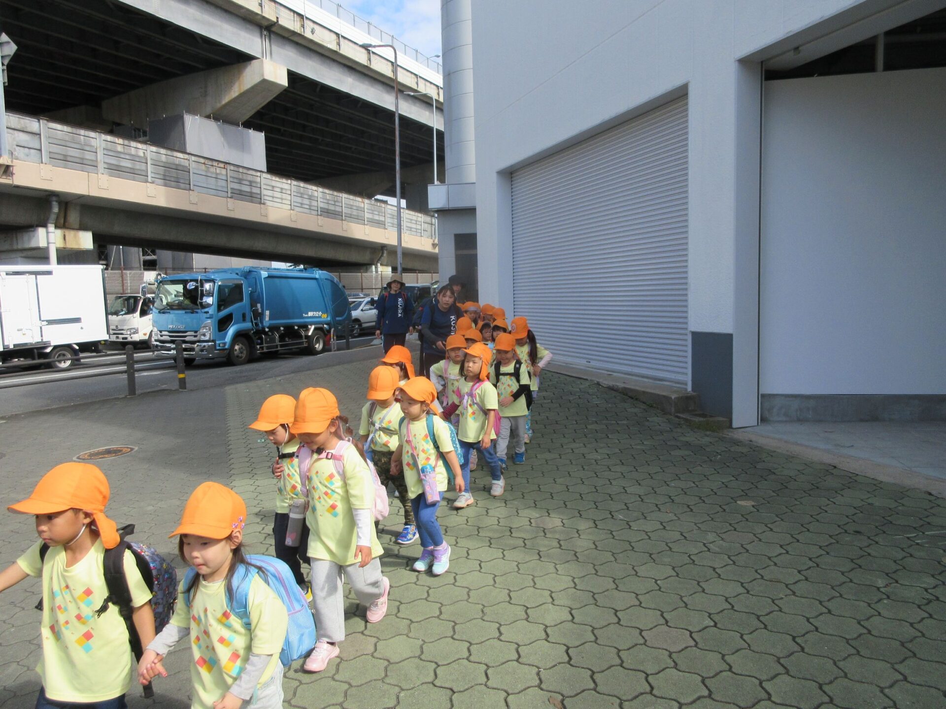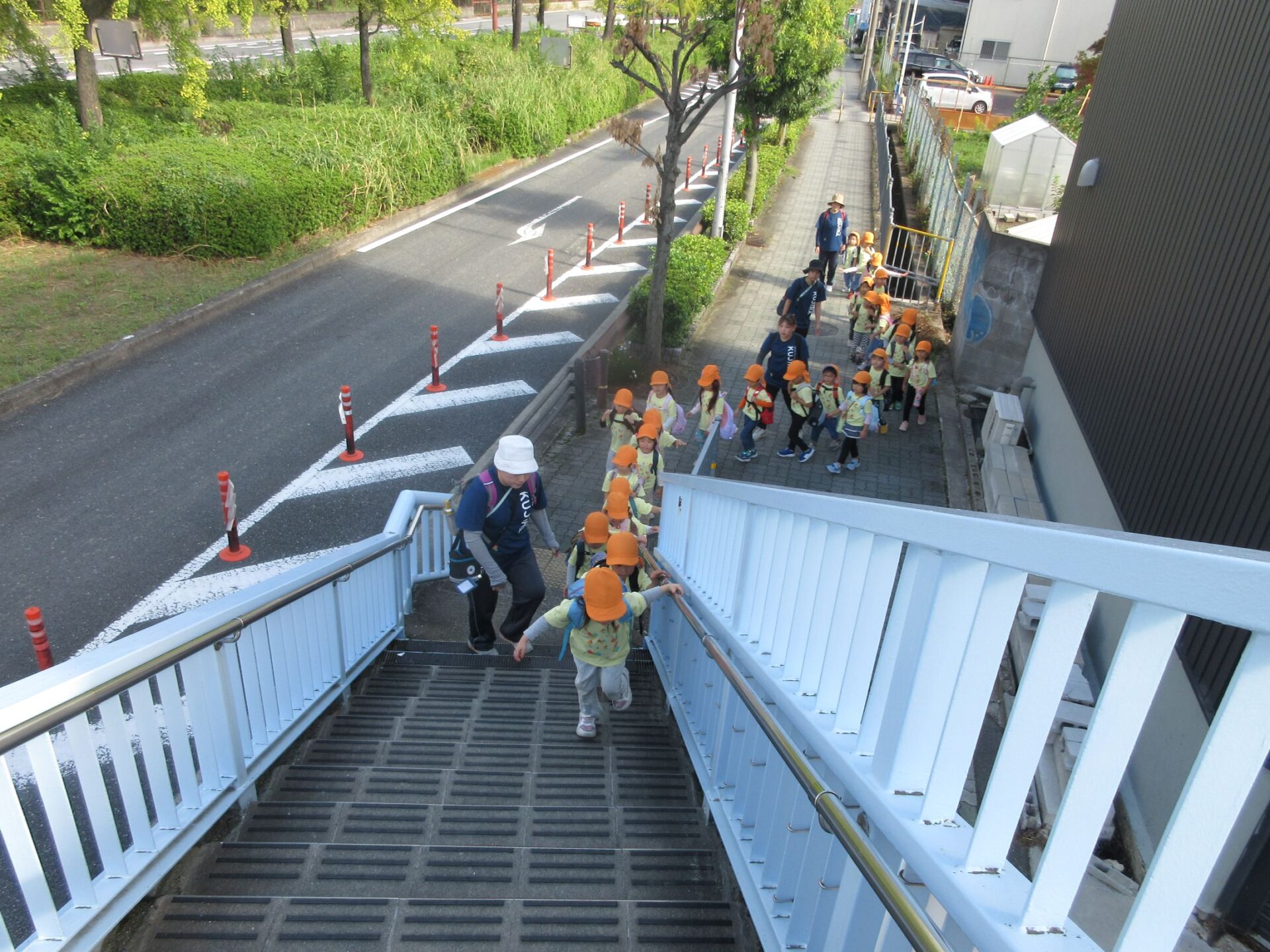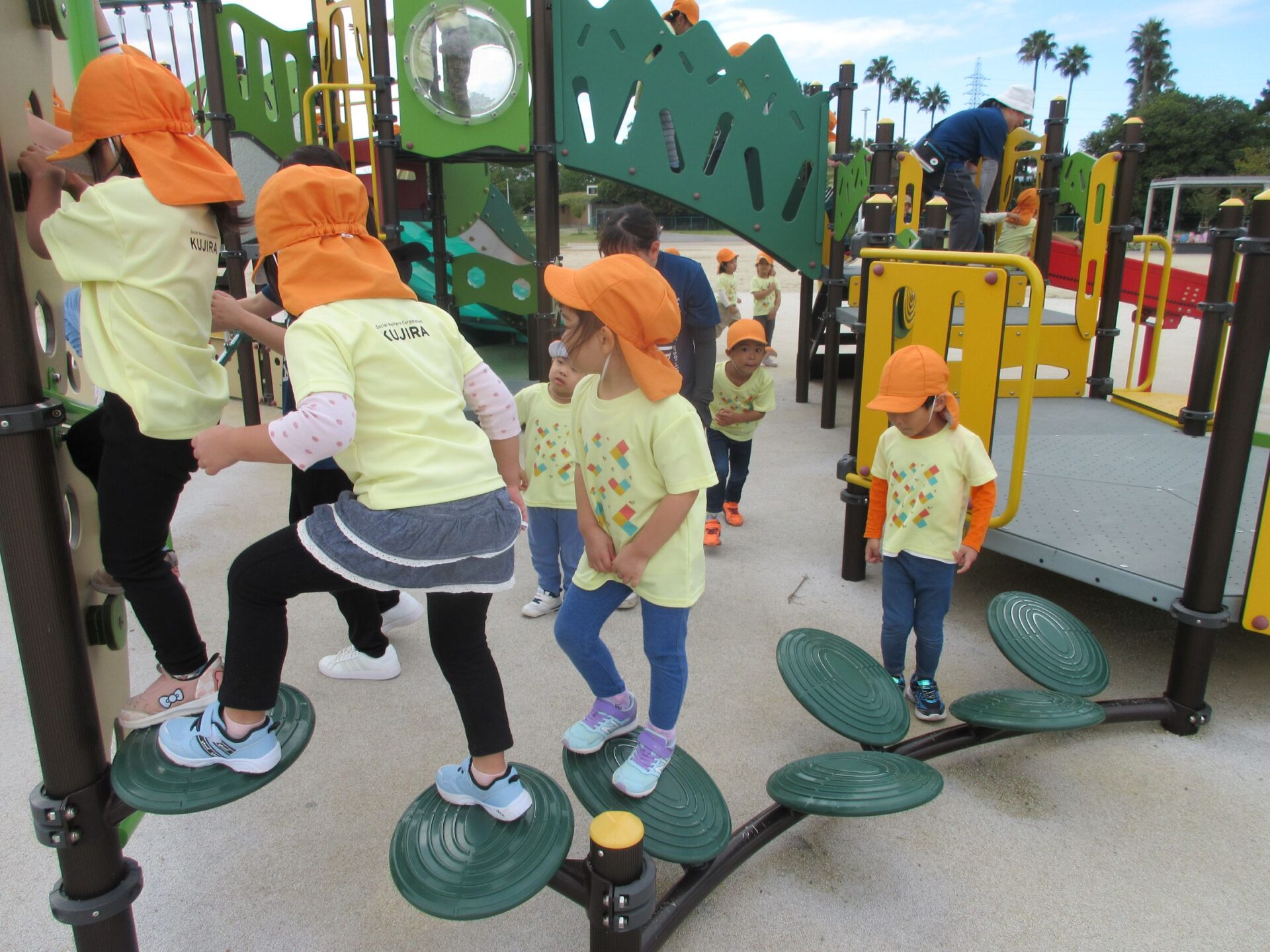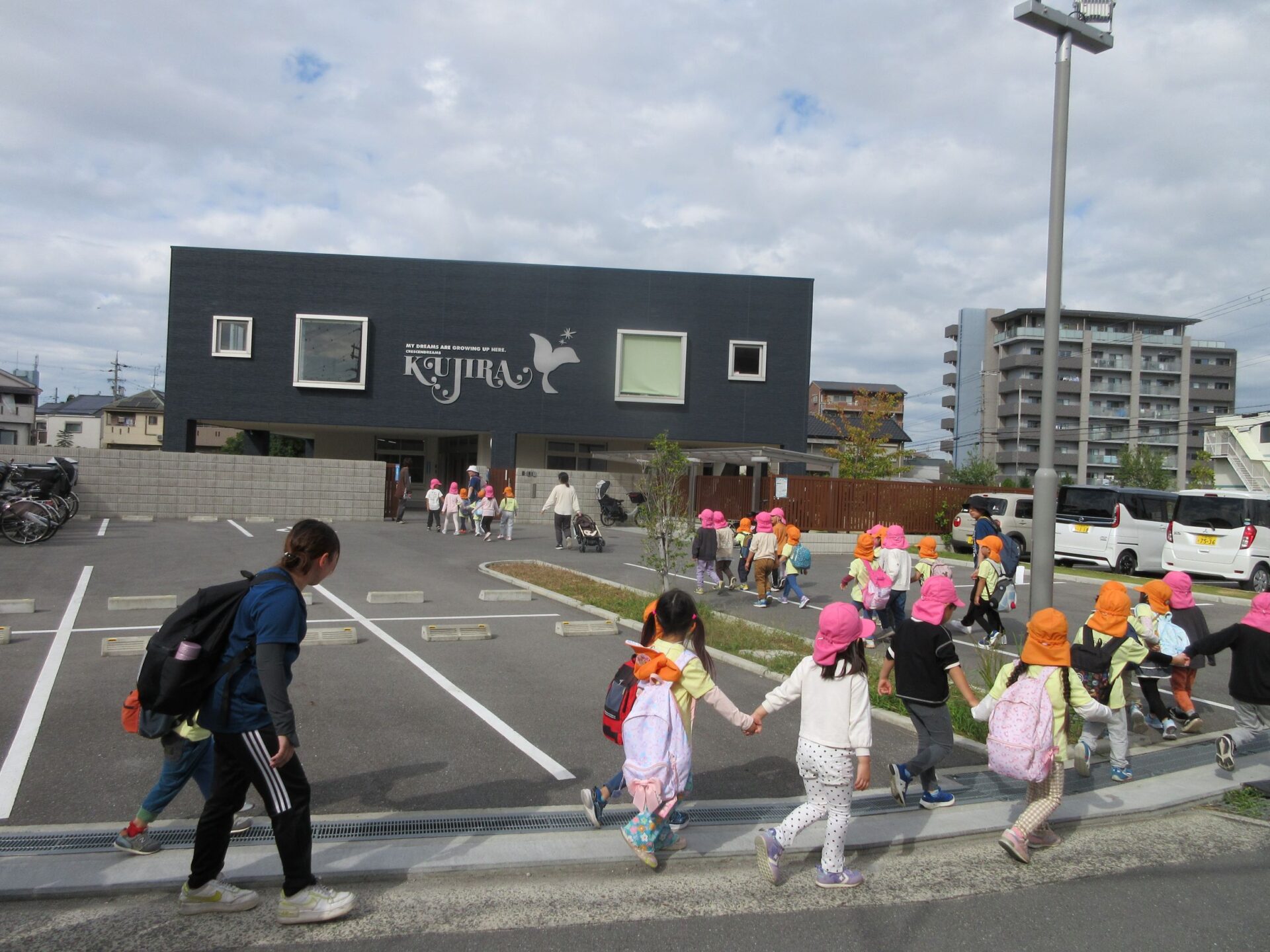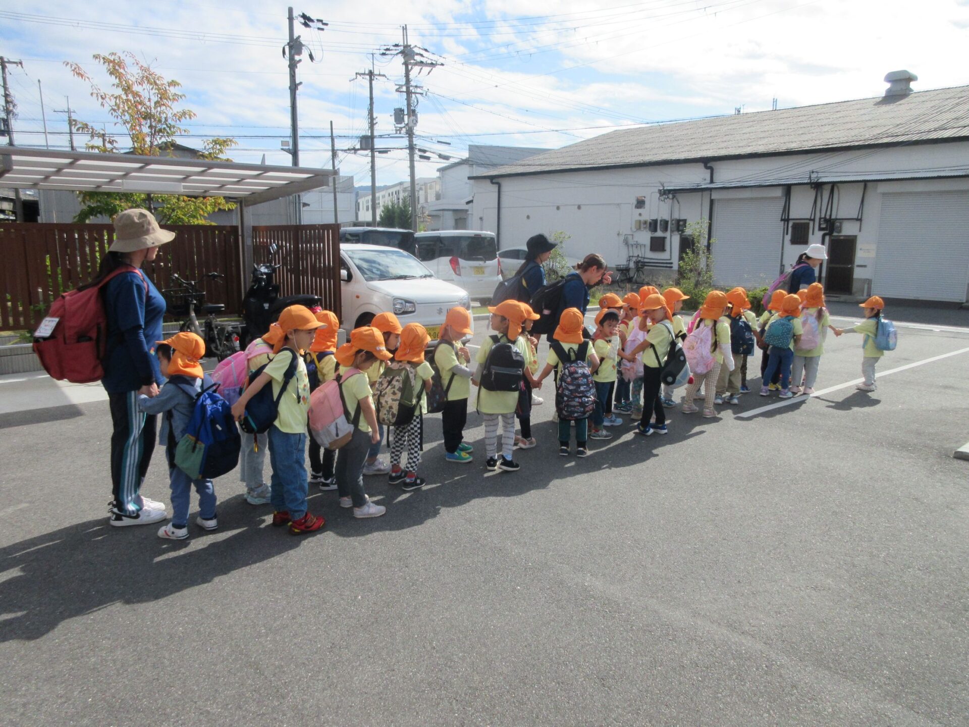 2025.11.14 お知らせ ブログ そら組(5歳)の遠足~久宝寺緑地~ 10月24日(金)、楽しみにしていた秋の遠足にしゅっぱ∼つ! 久宝寺緑地まで、今までで一番遠くへ出かけます。 くじらj組さんが窓から手を振って見送ってくれていましたね。 みんなが大好きな歩道橋。風が気持ちよくて、景色もきれいです。好きな車も走っているかな・・・。 30分ほど歩いて、久宝寺緑地のあいあい広場に到着。 遊具で遊びます。滑り台が2つありました。 壁をつたって移動したり 大きな網目の綱をつたって移動したり 先生と一緒に降りることもありました。 みんな、いろいろなことができるようになりましたね。 楽しそうないい笑顔です。 ここからは、滑り台を滑っているのが見れるんです! さあ、お弁当の準備です。 一生懸命、自分で準備をしました。 いただきま~す! 朝早くから、おいしいお弁当、ありがとう。 お弁当が終わったら、お楽しみのおやつタイムです。お弁当でおなかいっぱいだったけど、別腹…。 帰り道は、みんなへとへと。くたびれてしまいました。くじら組さんが、途中まで迎えに来てくれました。ありがとう。 元気が出ましたね。 帰りは、少し時間がかかったけど、無事に到着しました。 優しいお兄さんお姉さん、ありがとう。 一覧へ戻る