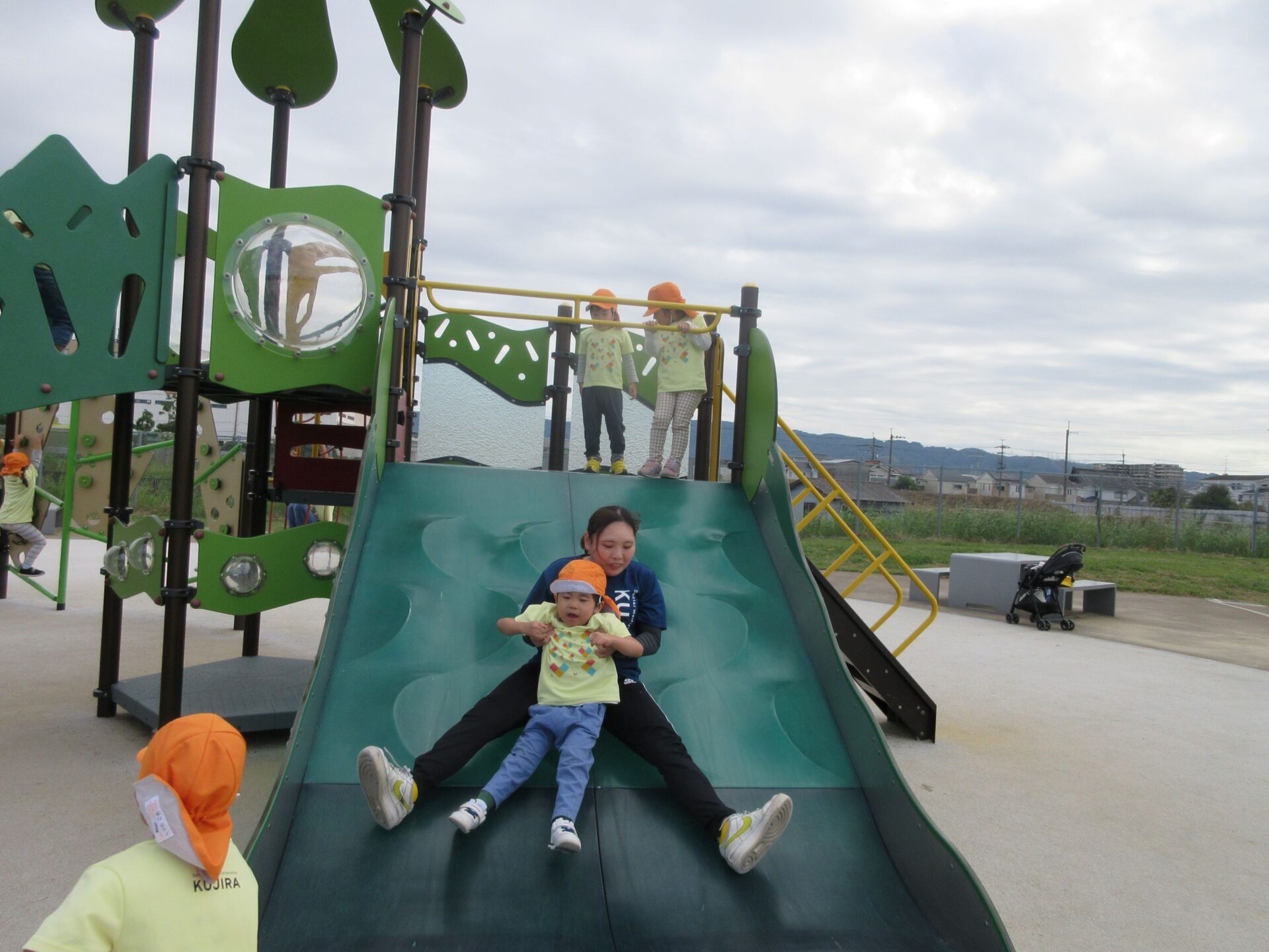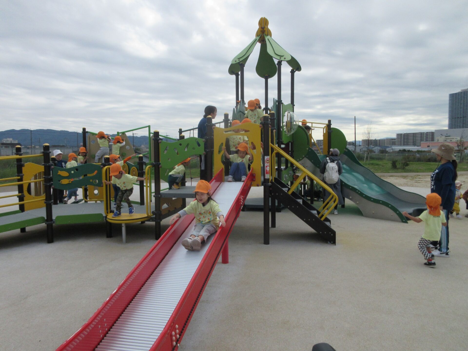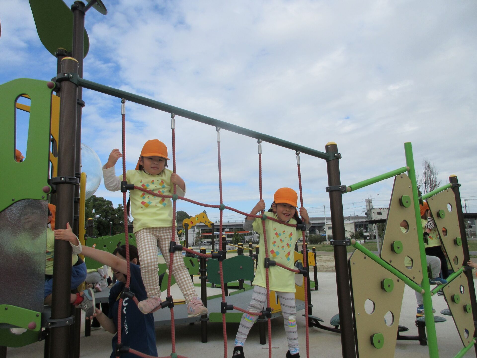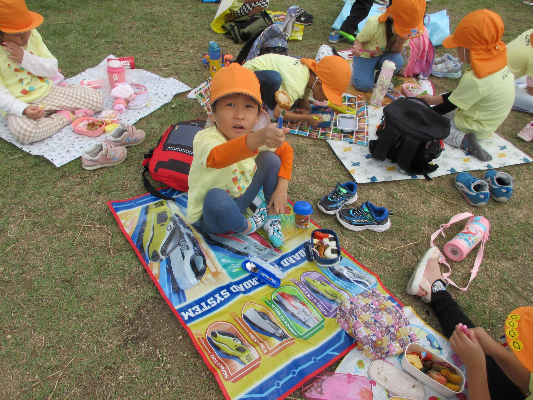 2025.11.14 お知らせ ブログ そら組(5歳)の遠足~久宝寺緑地~ 10月24日(金)、楽しみにしていた秋の遠足にしゅっぱ∼つ! 久宝寺緑地まで、今までで一番遠くへ出かけます。 くじらj組さんが窓から手を振って見送ってくれていましたね。 みんなが大好きな歩道橋。風が気持ちよくて、景色もきれいです。好きな車も走っているかな・・・。 30分ほど歩いて、久宝寺緑地のあいあい広場に到着。 遊具で遊びます。滑り台が2つありました。 壁をつたって移動したり 大きな網目の綱をつたって移動したり 先生と一緒に降りることもありました。 みんな、いろいろなことができるようになりましたね。 楽しそうないい笑顔です。 ここからは、滑り台を滑っているのが見れるんです! さあ、お弁当の準備です。 一生懸命、自分で準備をしました。 いただきま~す! 朝早くから、おいしいお弁当、ありがとう。 お弁当が終わったら、お楽しみのおやつタイムです。お弁当でおなかいっぱいだったけど、別腹…。 帰り道は、みんなへとへと。くたびれてしまいました。くじら組さんが、途中まで迎えに来てくれました。ありがとう。 元気が出ましたね。 帰りは、少し時間がかかったけど、無事に到着しました。 優しいお兄さんお姉さん、ありがとう。 一覧へ戻る