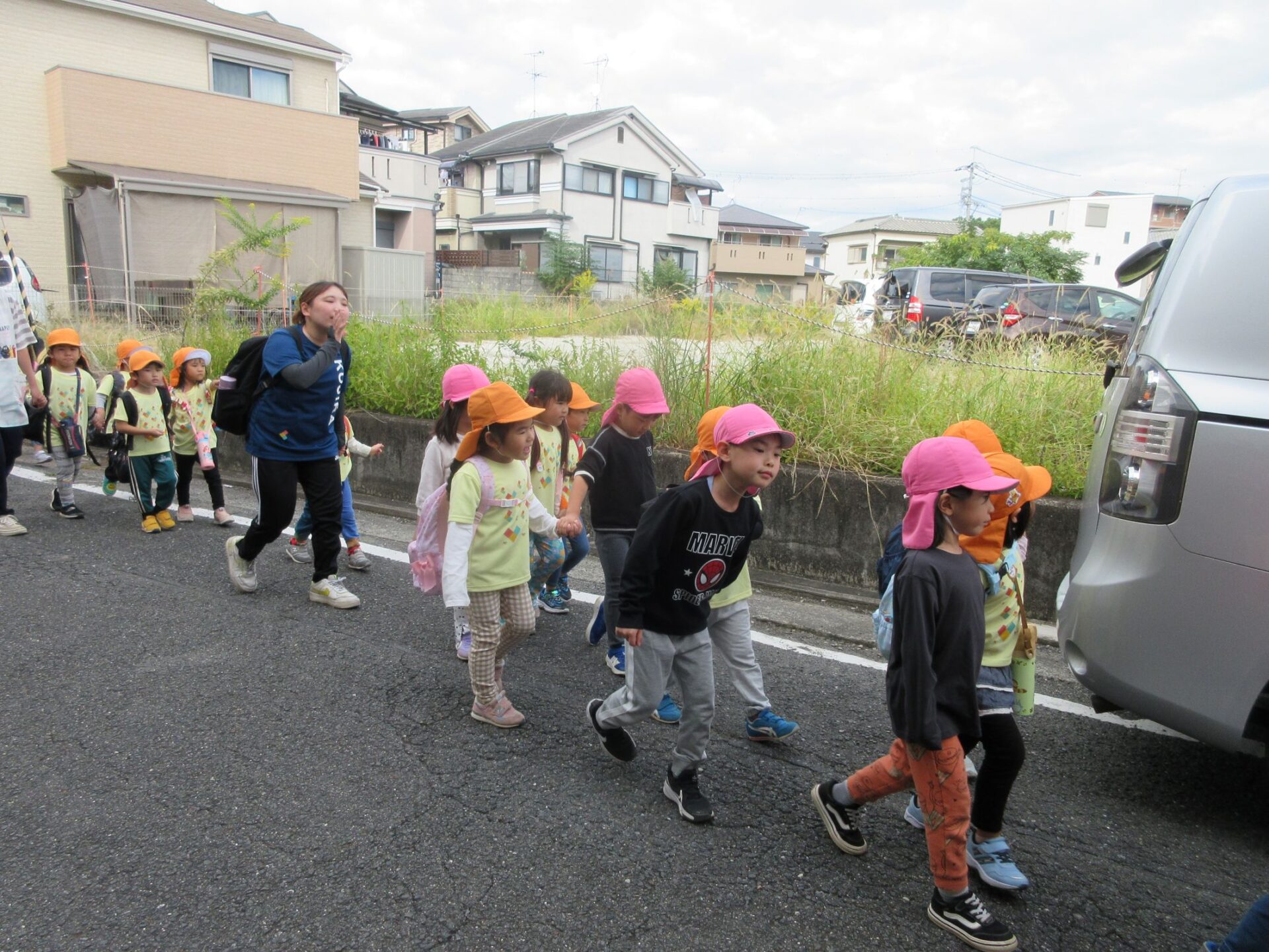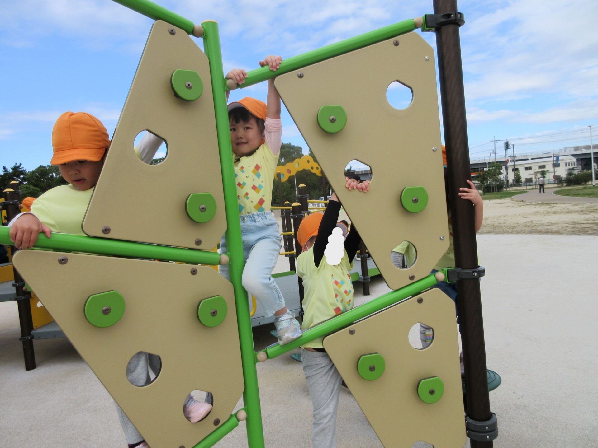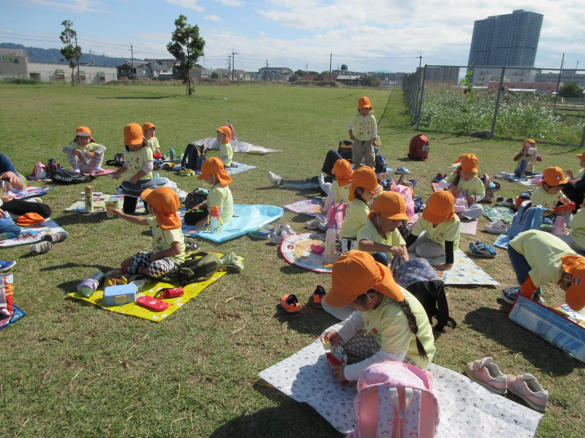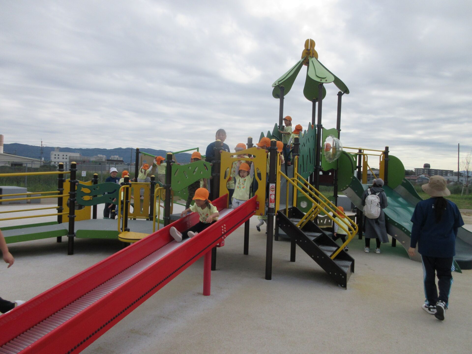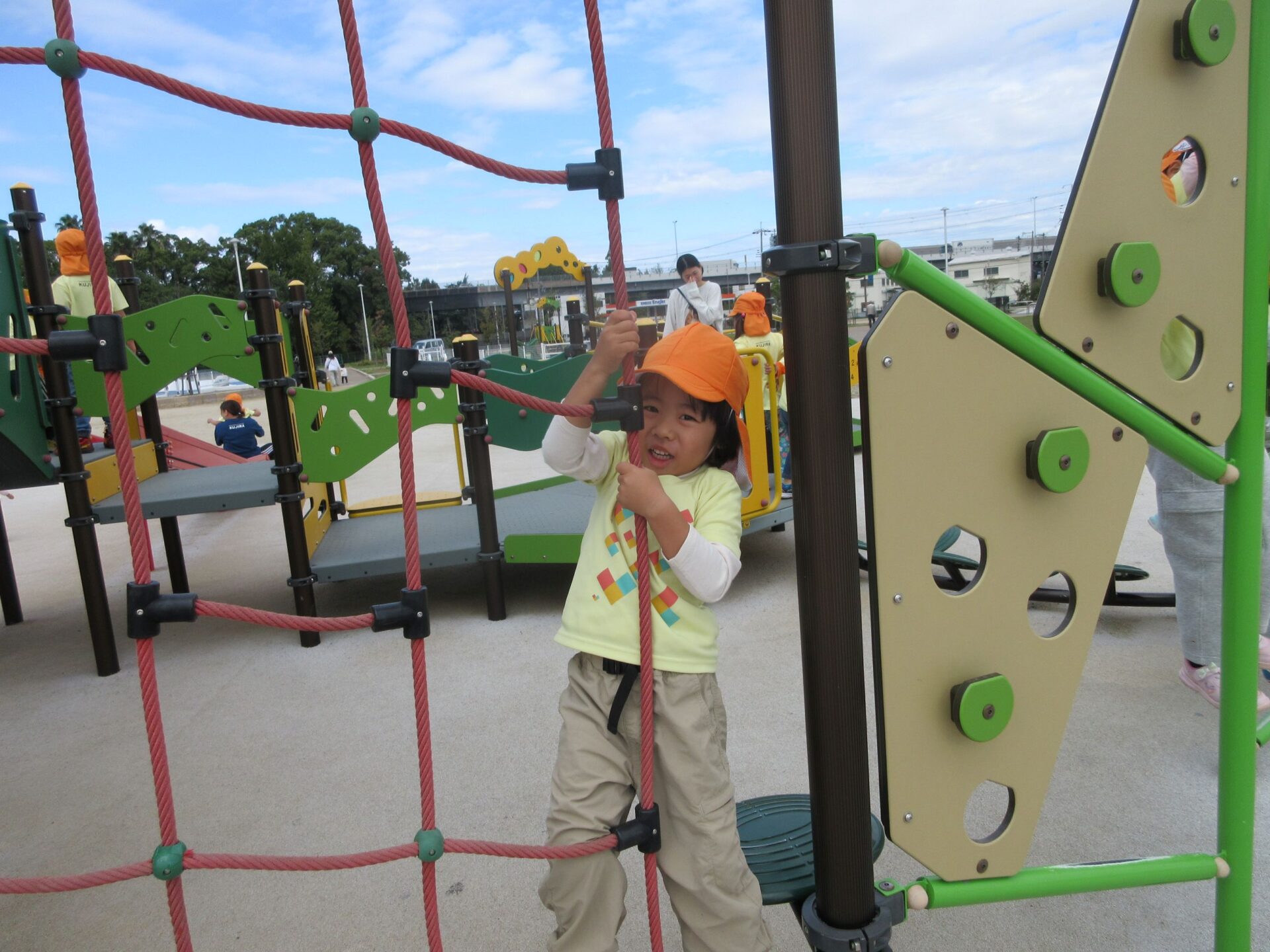 2025.11.14 お知らせ ブログ そら組(5歳)の遠足~久宝寺緑地~ 10月24日(金)、楽しみにしていた秋の遠足にしゅっぱ∼つ! 久宝寺緑地まで、今までで一番遠くへ出かけます。 くじらj組さんが窓から手を振って見送ってくれていましたね。 みんなが大好きな歩道橋。風が気持ちよくて、景色もきれいです。好きな車も走っているかな・・・。 30分ほど歩いて、久宝寺緑地のあいあい広場に到着。 遊具で遊びます。滑り台が2つありました。 壁をつたって移動したり 大きな網目の綱をつたって移動したり 先生と一緒に降りることもありました。 みんな、いろいろなことができるようになりましたね。 楽しそうないい笑顔です。 ここからは、滑り台を滑っているのが見れるんです! さあ、お弁当の準備です。 一生懸命、自分で準備をしました。 いただきま~す! 朝早くから、おいしいお弁当、ありがとう。 お弁当が終わったら、お楽しみのおやつタイムです。お弁当でおなかいっぱいだったけど、別腹…。 帰り道は、みんなへとへと。くたびれてしまいました。くじら組さんが、途中まで迎えに来てくれました。ありがとう。 元気が出ましたね。 帰りは、少し時間がかかったけど、無事に到着しました。 優しいお兄さんお姉さん、ありがとう。 一覧へ戻る