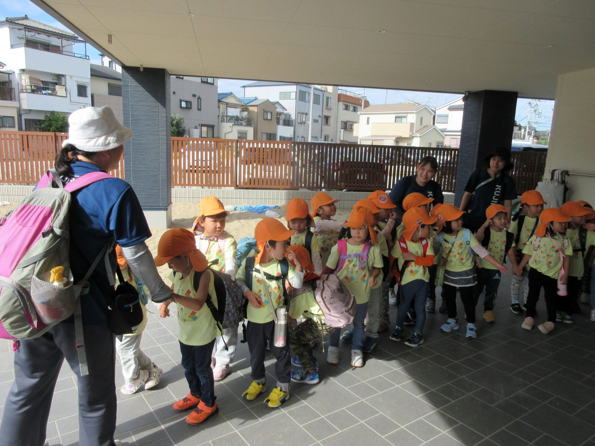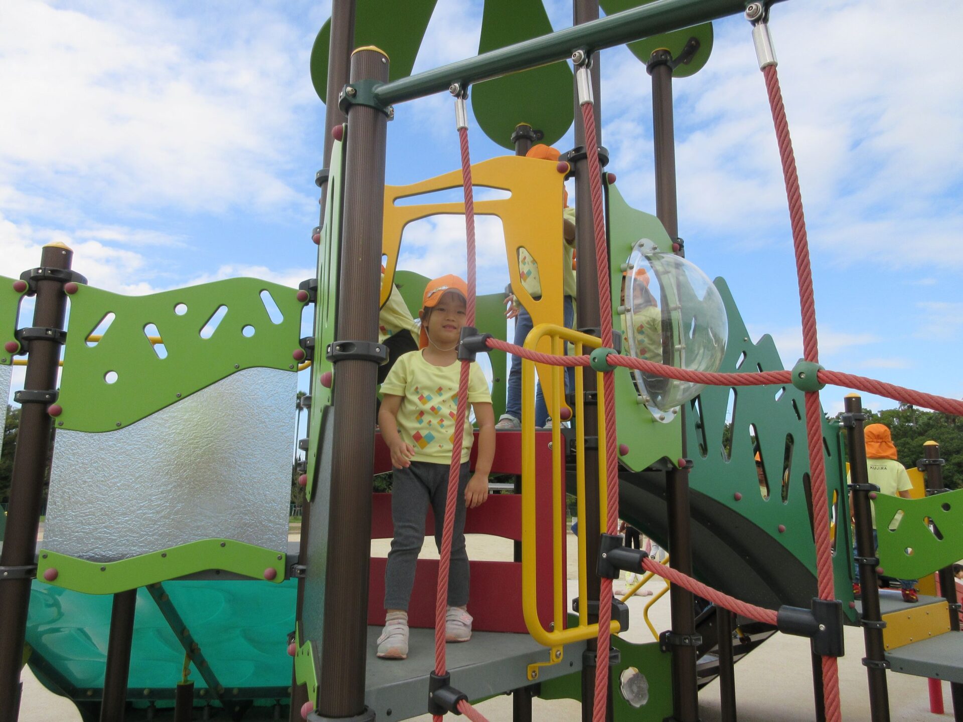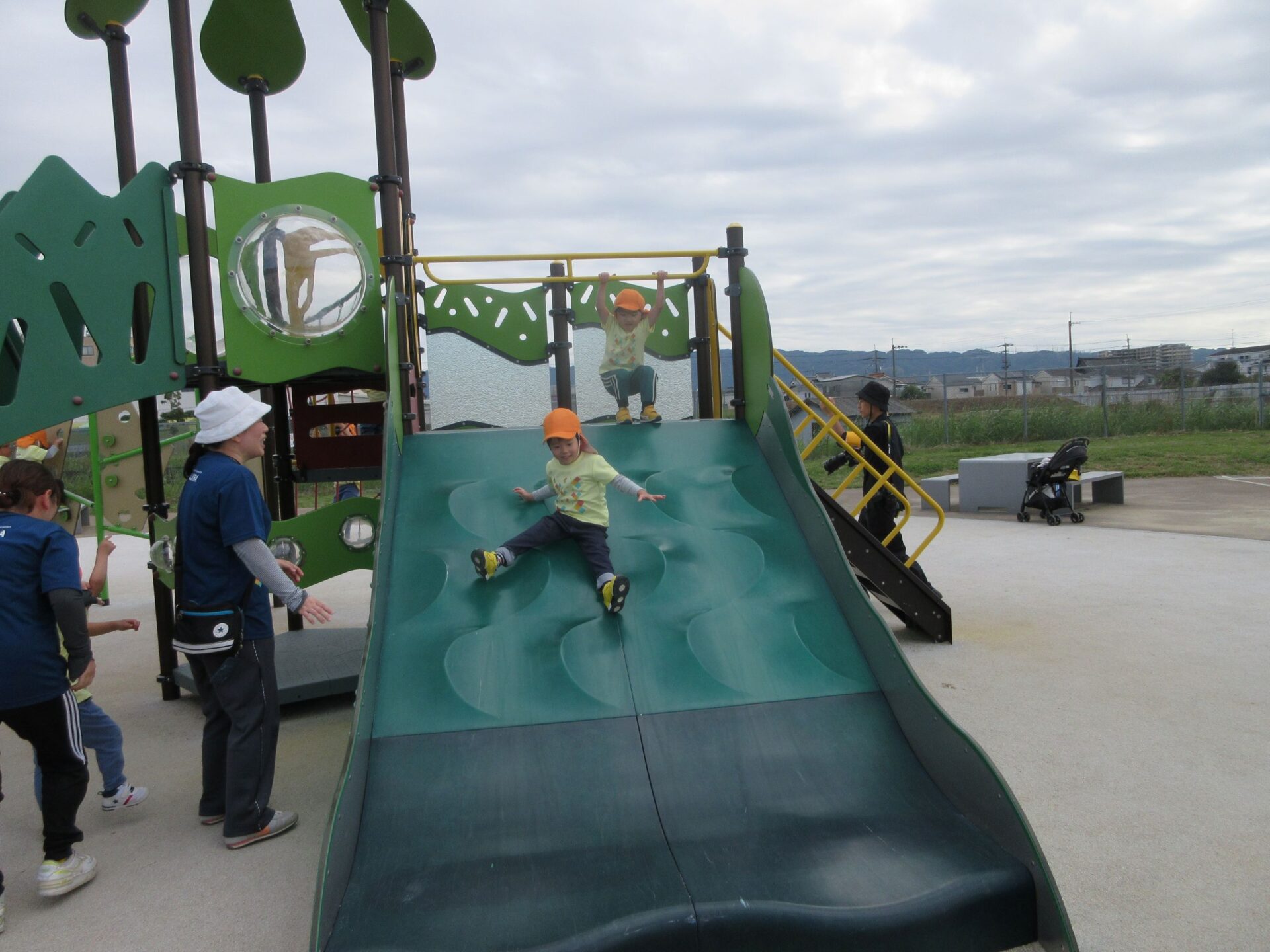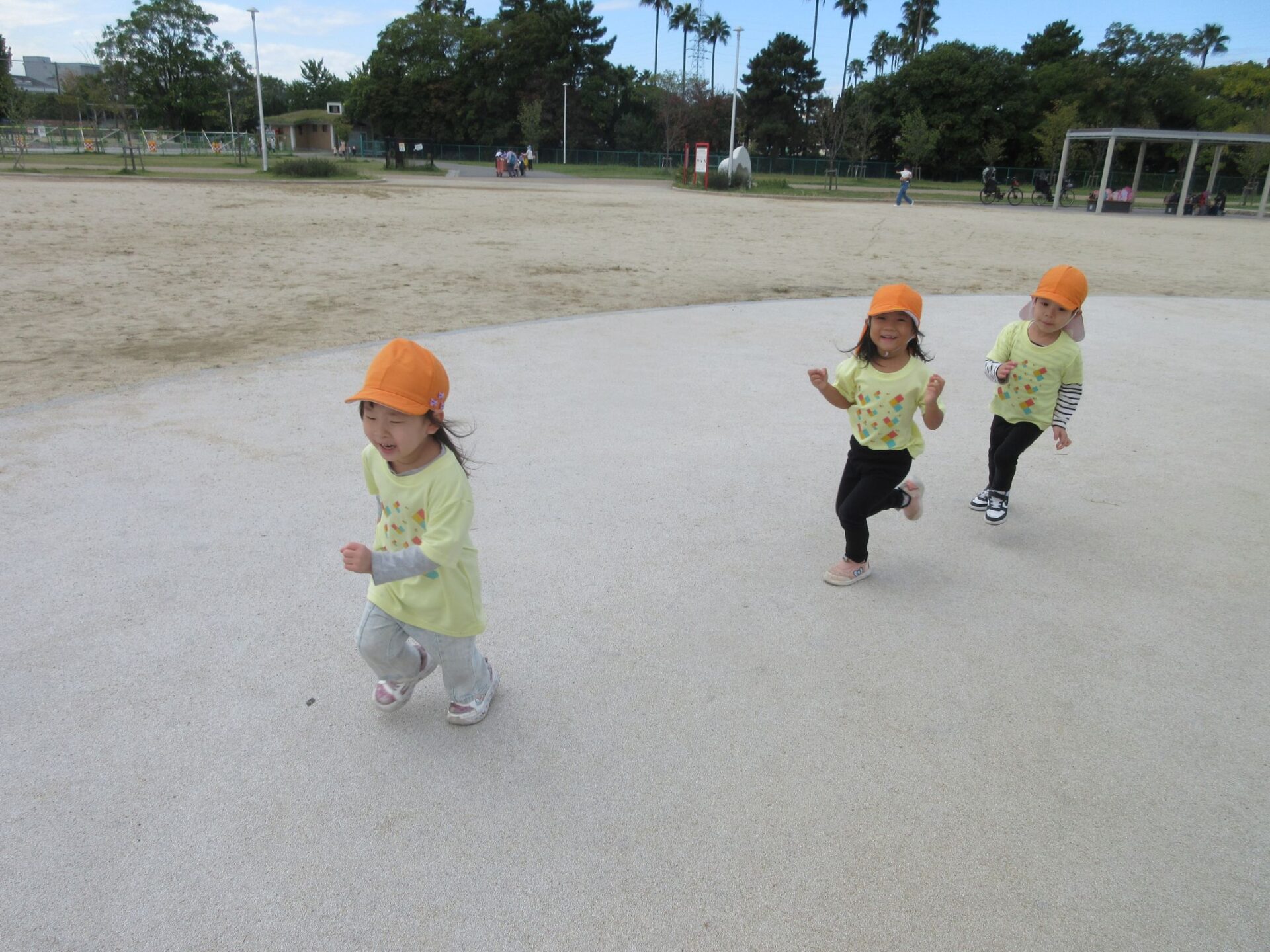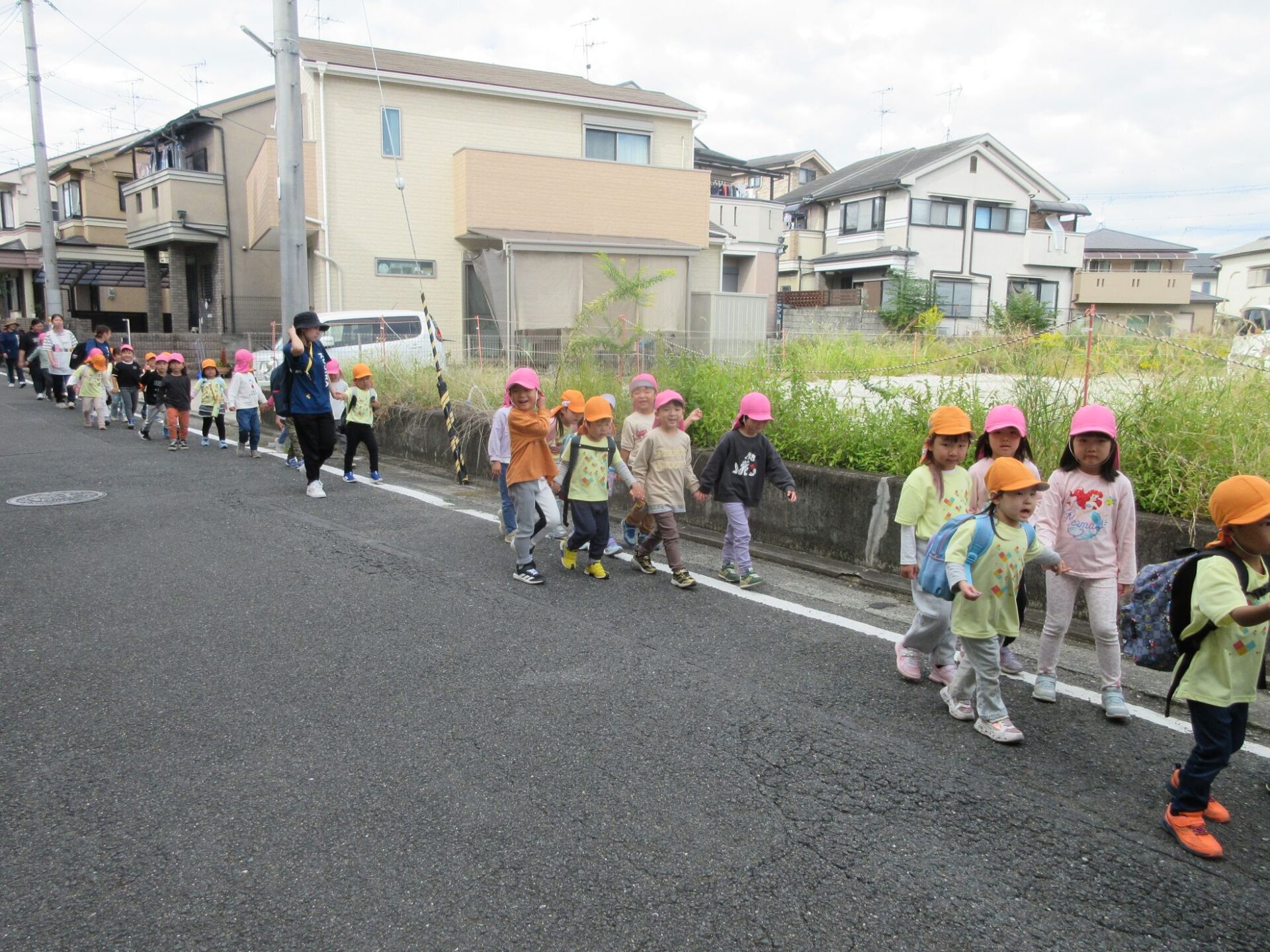 2025.11.14 お知らせ ブログ そら組(5歳)の遠足~久宝寺緑地~ 10月24日(金)、楽しみにしていた秋の遠足にしゅっぱ∼つ! 久宝寺緑地まで、今までで一番遠くへ出かけます。 くじらj組さんが窓から手を振って見送ってくれていましたね。 みんなが大好きな歩道橋。風が気持ちよくて、景色もきれいです。好きな車も走っているかな・・・。 30分ほど歩いて、久宝寺緑地のあいあい広場に到着。 遊具で遊びます。滑り台が2つありました。 壁をつたって移動したり 大きな網目の綱をつたって移動したり 先生と一緒に降りることもありました。 みんな、いろいろなことができるようになりましたね。 楽しそうないい笑顔です。 ここからは、滑り台を滑っているのが見れるんです! さあ、お弁当の準備です。 一生懸命、自分で準備をしました。 いただきま~す! 朝早くから、おいしいお弁当、ありがとう。 お弁当が終わったら、お楽しみのおやつタイムです。お弁当でおなかいっぱいだったけど、別腹…。 帰り道は、みんなへとへと。くたびれてしまいました。くじら組さんが、途中まで迎えに来てくれました。ありがとう。 元気が出ましたね。 帰りは、少し時間がかかったけど、無事に到着しました。 優しいお兄さんお姉さん、ありがとう。 一覧へ戻る
