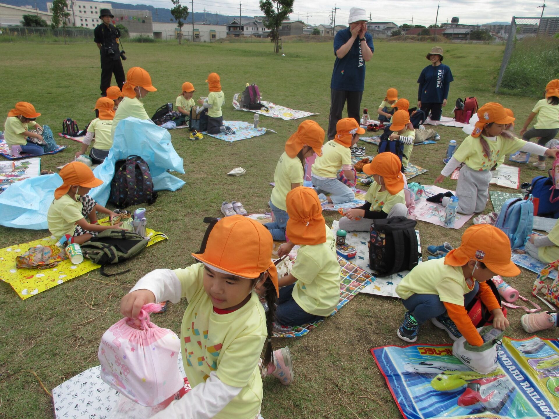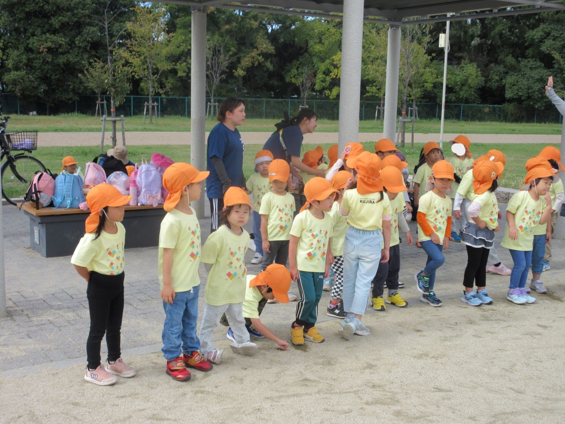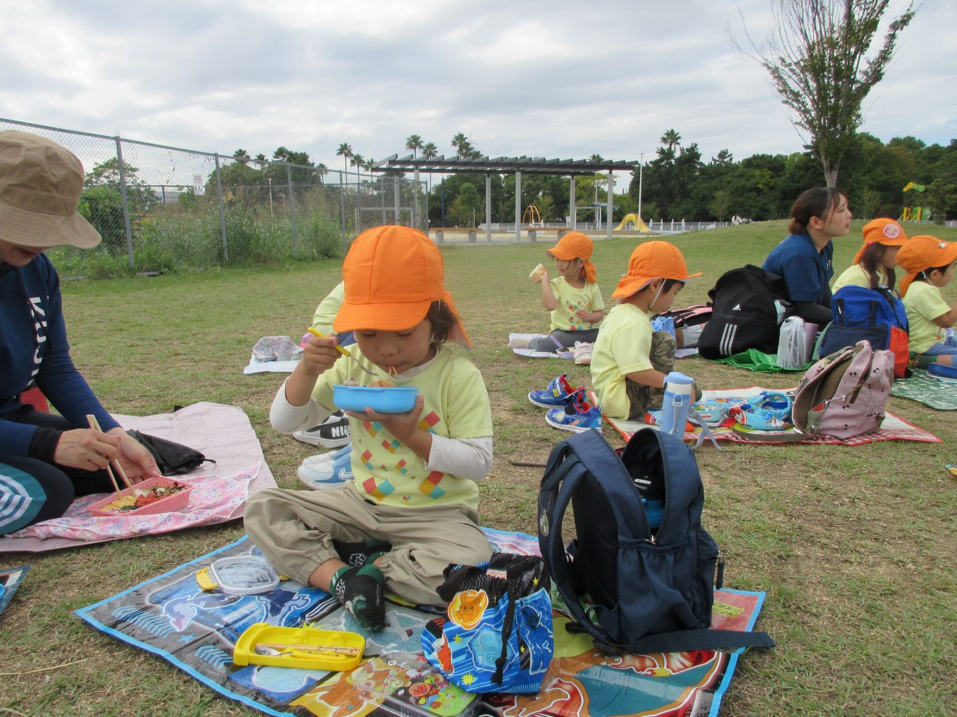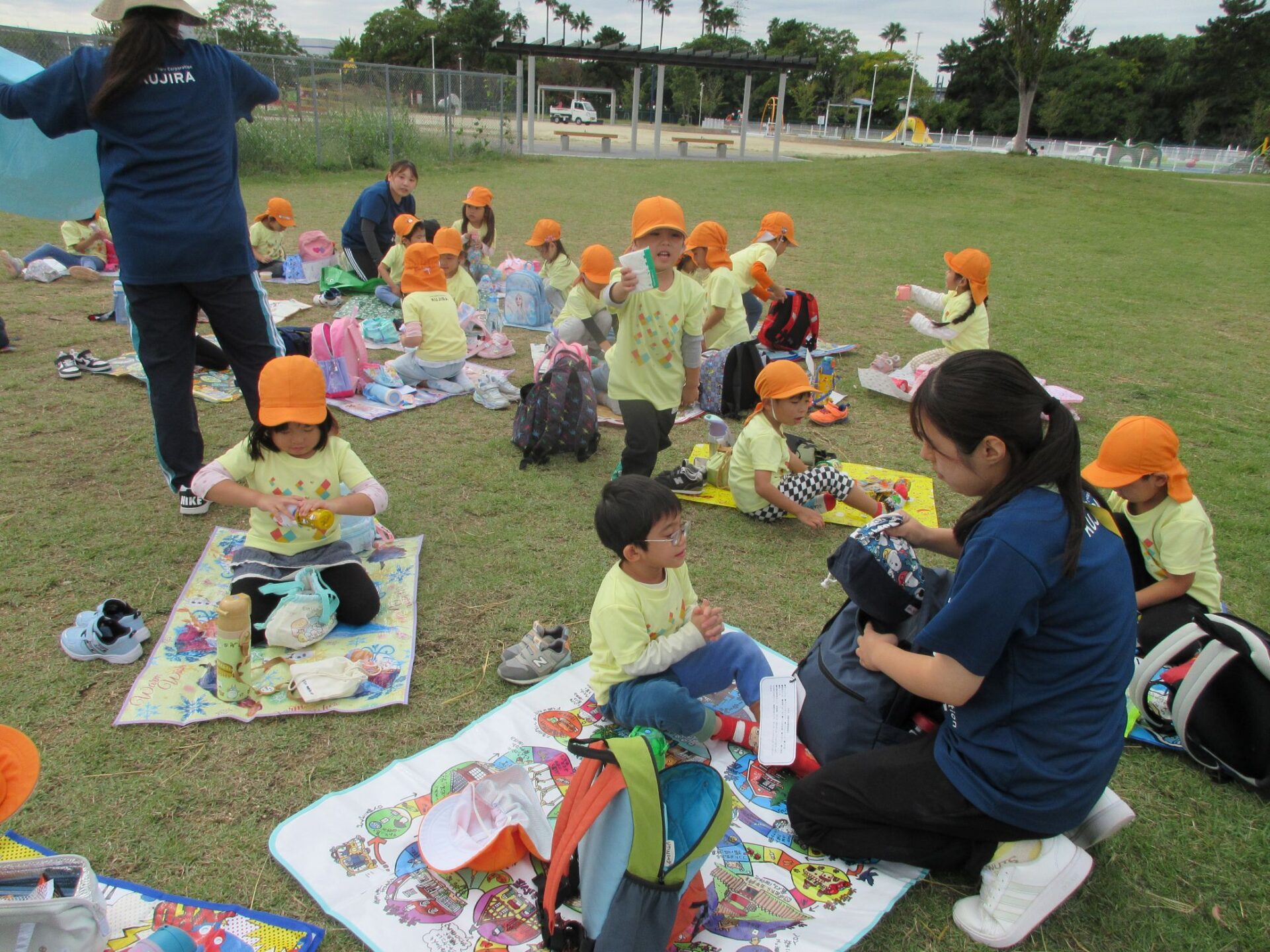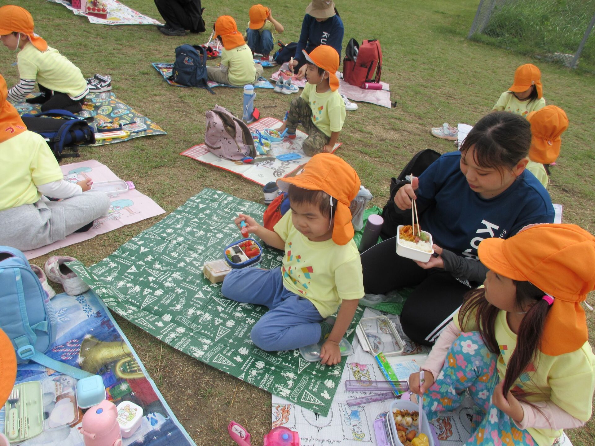 2025.11.14 お知らせ ブログ そら組(5歳)の遠足~久宝寺緑地~ 10月24日(金)、楽しみにしていた秋の遠足にしゅっぱ∼つ! 久宝寺緑地まで、今までで一番遠くへ出かけます。 くじらj組さんが窓から手を振って見送ってくれていましたね。 みんなが大好きな歩道橋。風が気持ちよくて、景色もきれいです。好きな車も走っているかな・・・。 30分ほど歩いて、久宝寺緑地のあいあい広場に到着。 遊具で遊びます。滑り台が2つありました。 壁をつたって移動したり 大きな網目の綱をつたって移動したり 先生と一緒に降りることもありました。 みんな、いろいろなことができるようになりましたね。 楽しそうないい笑顔です。 ここからは、滑り台を滑っているのが見れるんです! さあ、お弁当の準備です。 一生懸命、自分で準備をしました。 いただきま~す! 朝早くから、おいしいお弁当、ありがとう。 お弁当が終わったら、お楽しみのおやつタイムです。お弁当でおなかいっぱいだったけど、別腹…。 帰り道は、みんなへとへと。くたびれてしまいました。くじら組さんが、途中まで迎えに来てくれました。ありがとう。 元気が出ましたね。 帰りは、少し時間がかかったけど、無事に到着しました。 優しいお兄さんお姉さん、ありがとう。 一覧へ戻る