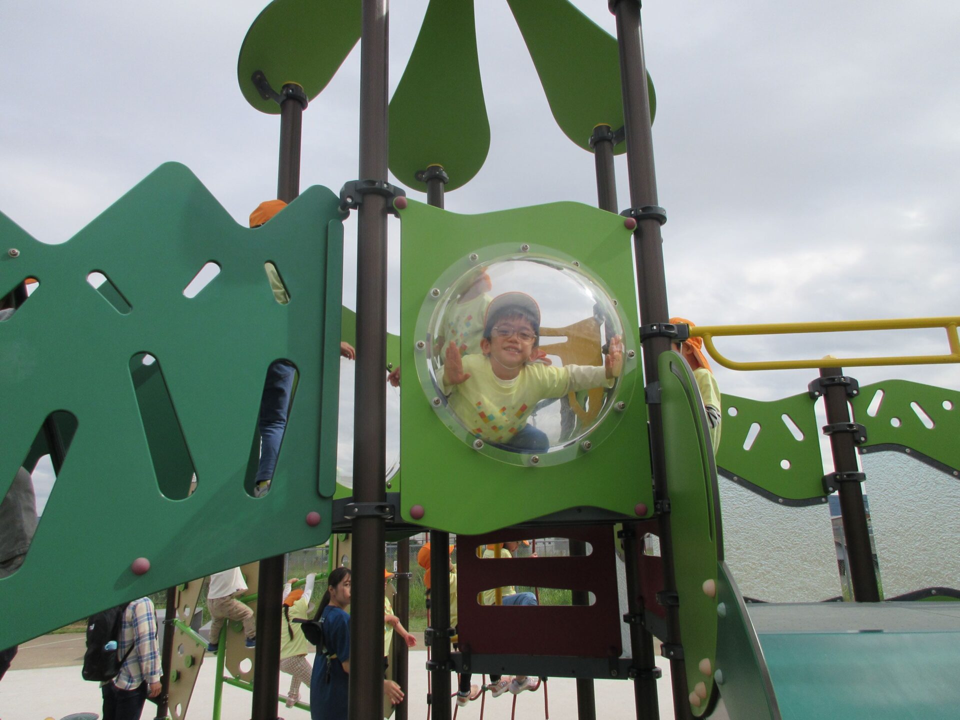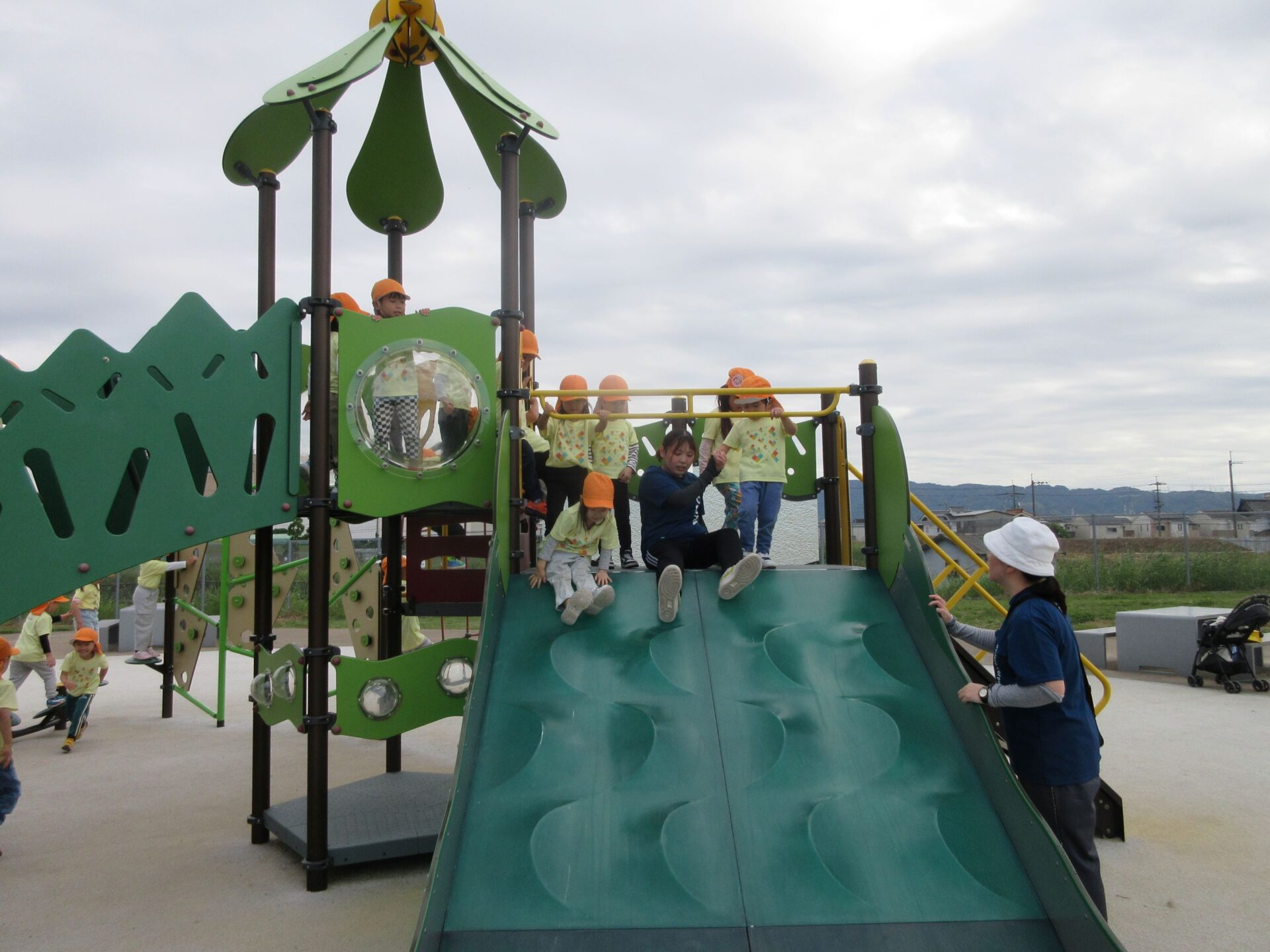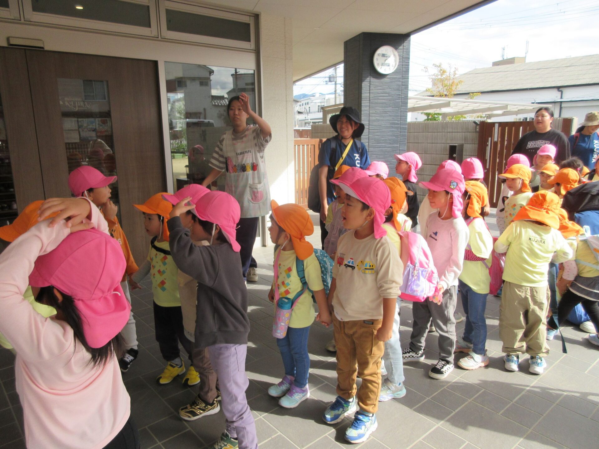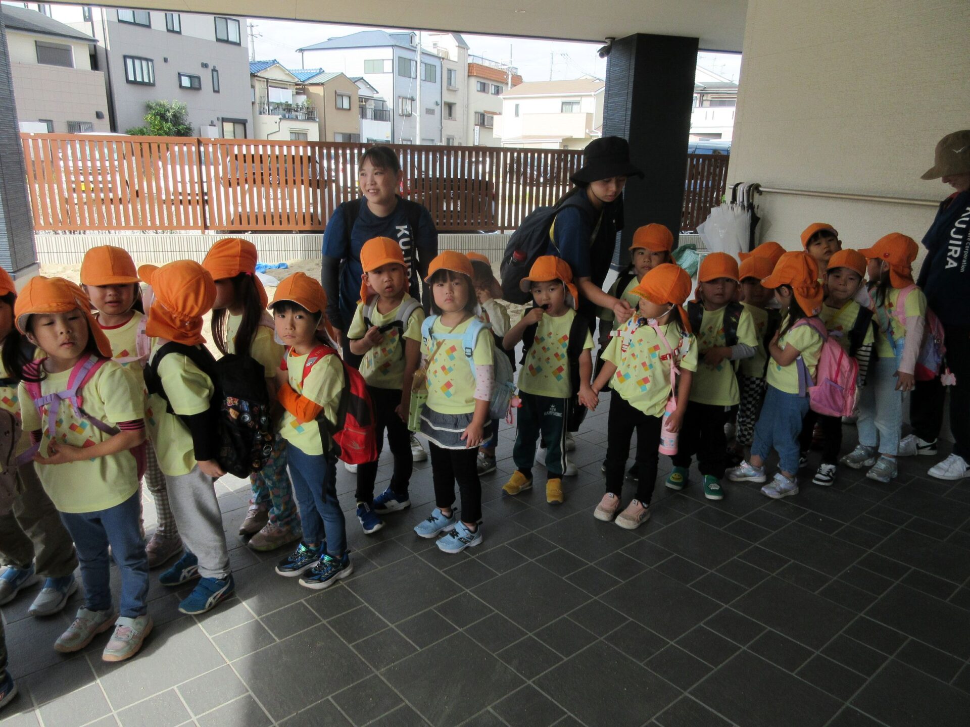 2025.11.14 お知らせ ブログ そら組(5歳)の遠足~久宝寺緑地~ 10月24日(金)、楽しみにしていた秋の遠足にしゅっぱ∼つ! 久宝寺緑地まで、今までで一番遠くへ出かけます。 くじらj組さんが窓から手を振って見送ってくれていましたね。 みんなが大好きな歩道橋。風が気持ちよくて、景色もきれいです。好きな車も走っているかな・・・。 30分ほど歩いて、久宝寺緑地のあいあい広場に到着。 遊具で遊びます。滑り台が2つありました。 壁をつたって移動したり 大きな網目の綱をつたって移動したり 先生と一緒に降りることもありました。 みんな、いろいろなことができるようになりましたね。 楽しそうないい笑顔です。 ここからは、滑り台を滑っているのが見れるんです! さあ、お弁当の準備です。 一生懸命、自分で準備をしました。 いただきま~す! 朝早くから、おいしいお弁当、ありがとう。 お弁当が終わったら、お楽しみのおやつタイムです。お弁当でおなかいっぱいだったけど、別腹…。 帰り道は、みんなへとへと。くたびれてしまいました。くじら組さんが、途中まで迎えに来てくれました。ありがとう。 元気が出ましたね。 帰りは、少し時間がかかったけど、無事に到着しました。 優しいお兄さんお姉さん、ありがとう。 一覧へ戻る
