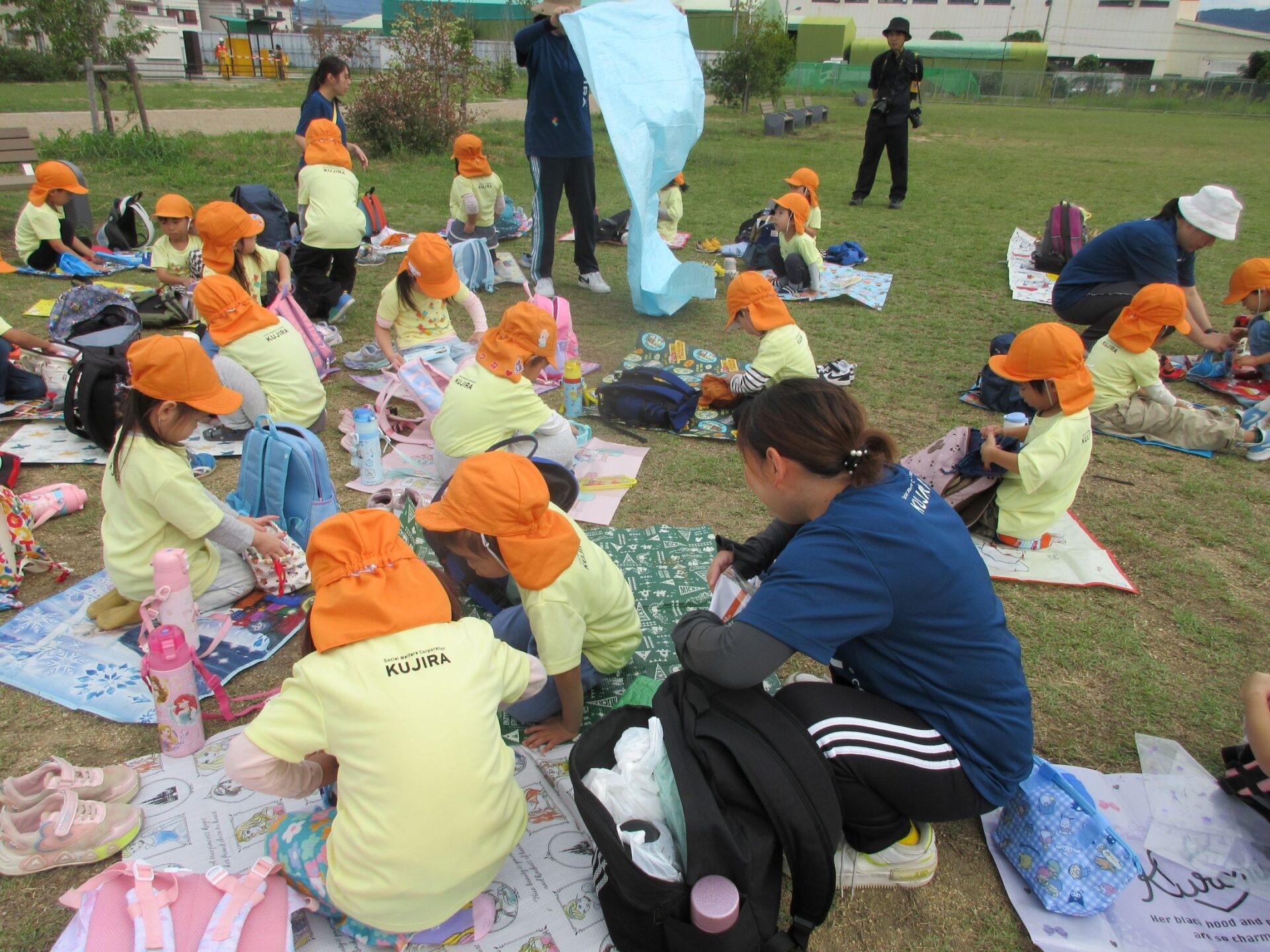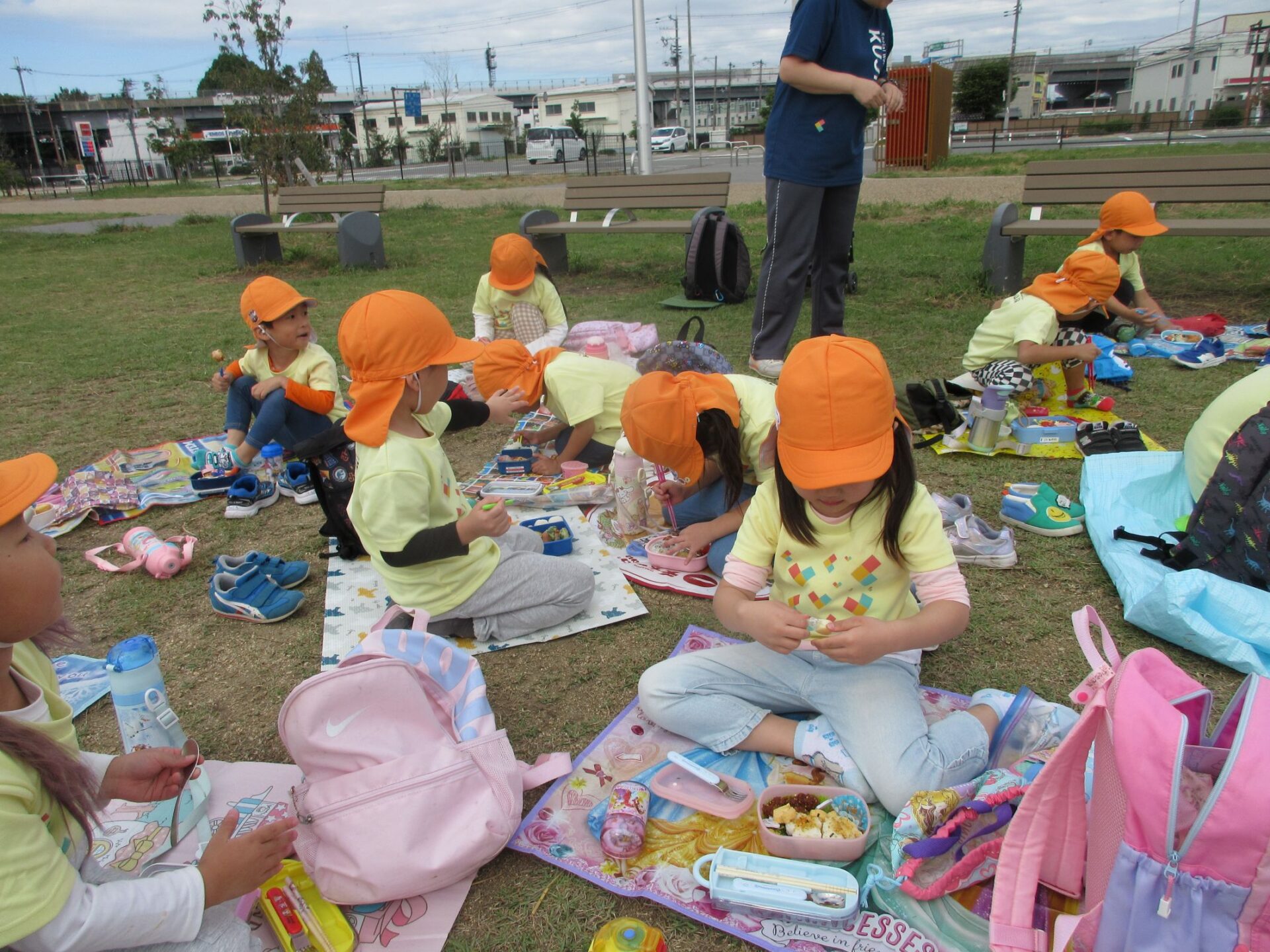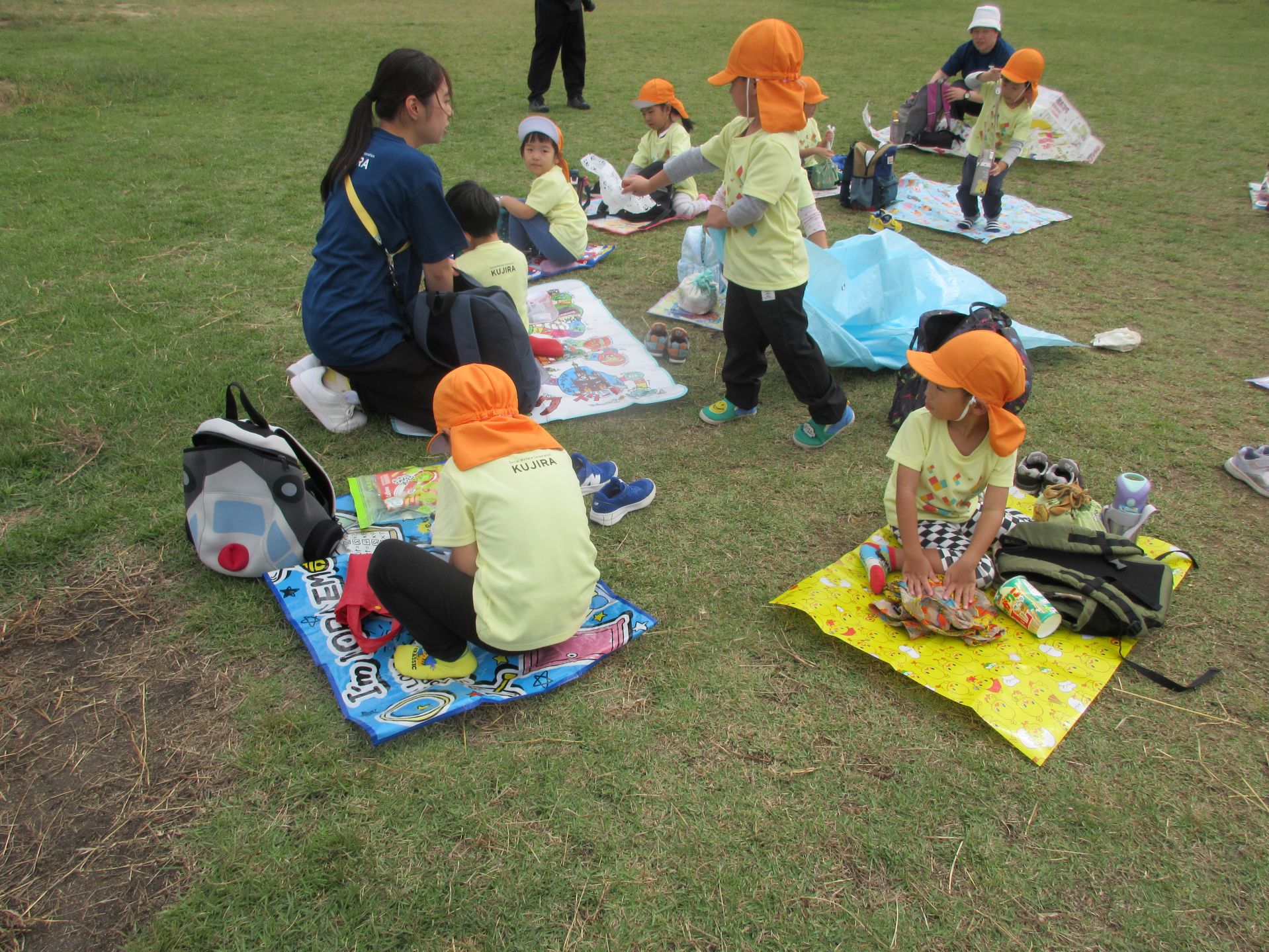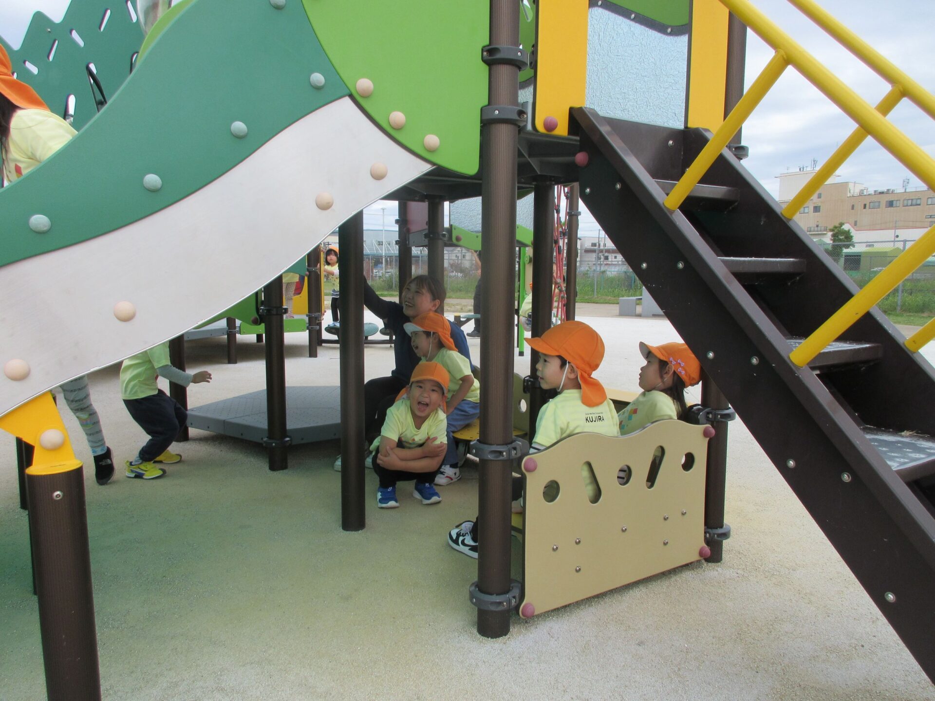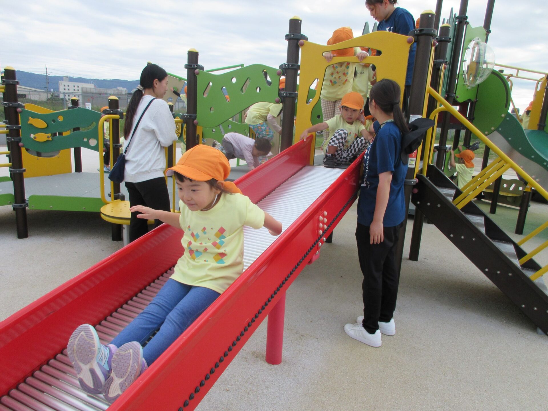 2025.11.14 お知らせ ブログ そら組(5歳)の遠足~久宝寺緑地~ 10月24日(金)、楽しみにしていた秋の遠足にしゅっぱ∼つ! 久宝寺緑地まで、今までで一番遠くへ出かけます。 くじらj組さんが窓から手を振って見送ってくれていましたね。 みんなが大好きな歩道橋。風が気持ちよくて、景色もきれいです。好きな車も走っているかな・・・。 30分ほど歩いて、久宝寺緑地のあいあい広場に到着。 遊具で遊びます。滑り台が2つありました。 壁をつたって移動したり 大きな網目の綱をつたって移動したり 先生と一緒に降りることもありました。 みんな、いろいろなことができるようになりましたね。 楽しそうないい笑顔です。 ここからは、滑り台を滑っているのが見れるんです! さあ、お弁当の準備です。 一生懸命、自分で準備をしました。 いただきま~す! 朝早くから、おいしいお弁当、ありがとう。 お弁当が終わったら、お楽しみのおやつタイムです。お弁当でおなかいっぱいだったけど、別腹…。 帰り道は、みんなへとへと。くたびれてしまいました。くじら組さんが、途中まで迎えに来てくれました。ありがとう。 元気が出ましたね。 帰りは、少し時間がかかったけど、無事に到着しました。 優しいお兄さんお姉さん、ありがとう。 一覧へ戻る