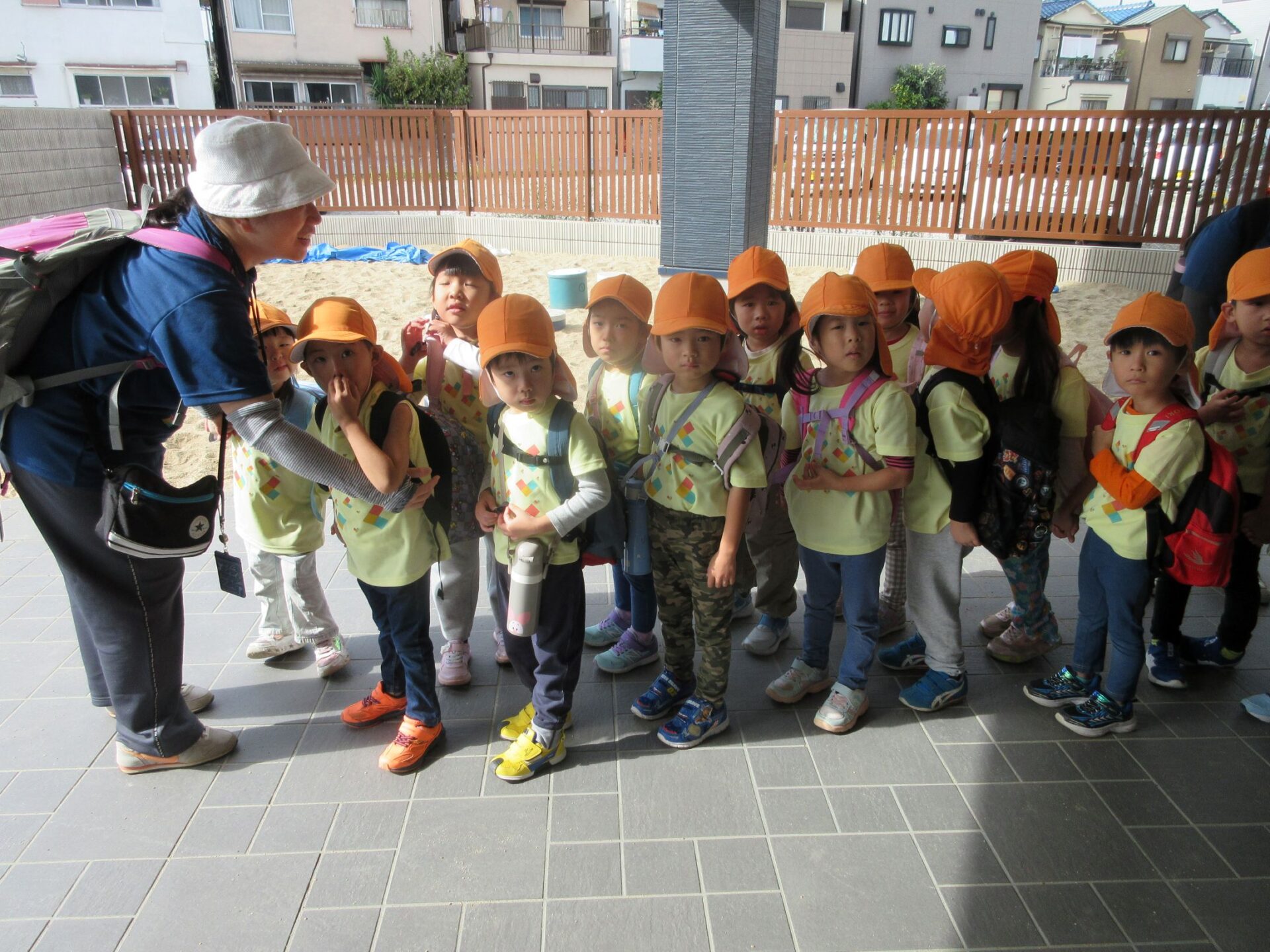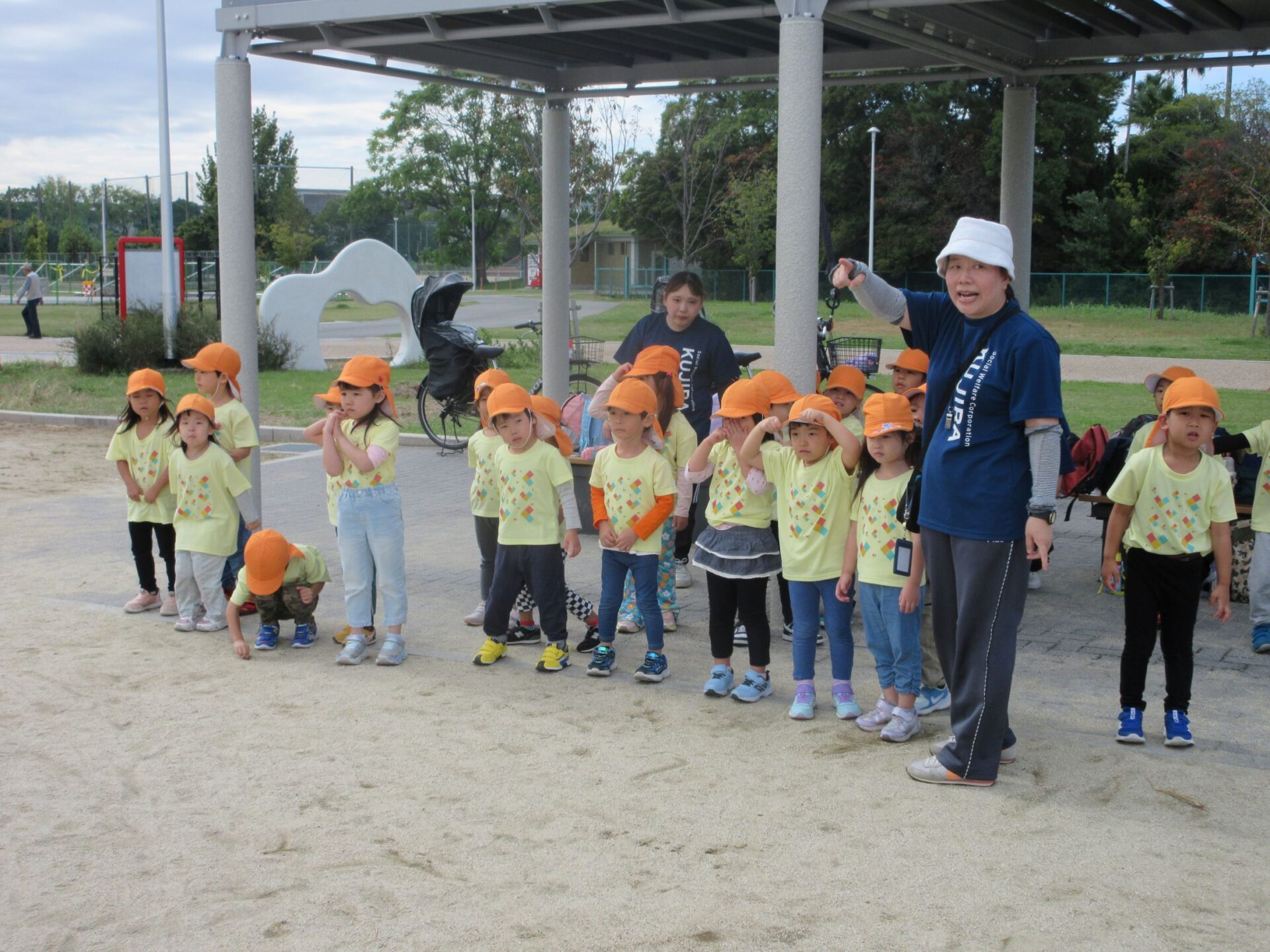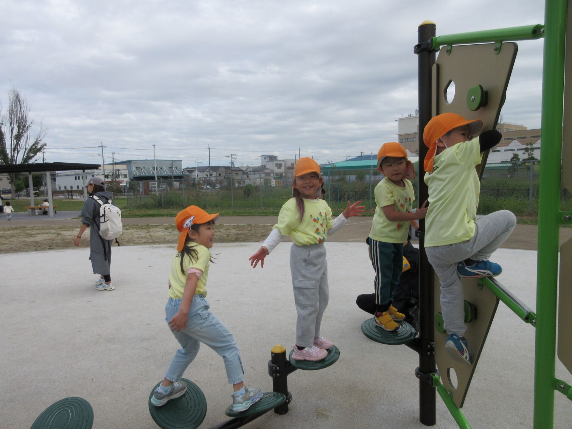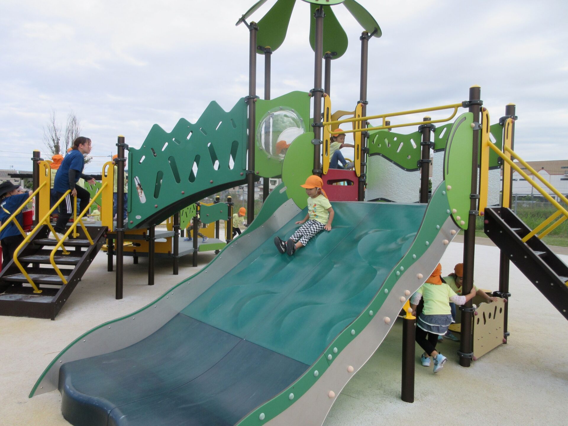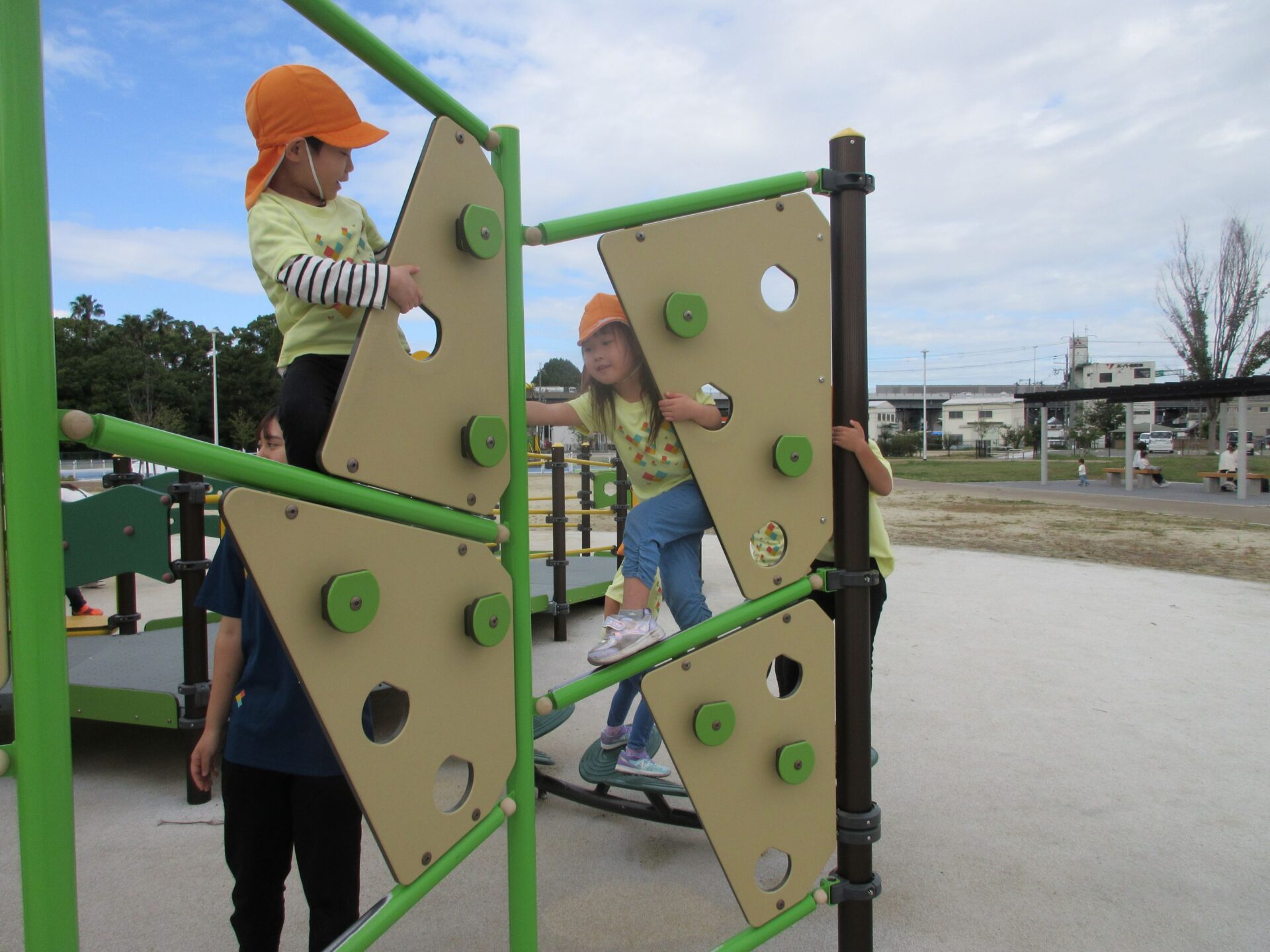2025.11.14 お知らせ ブログ そら組(5歳)の遠足~久宝寺緑地~ 10月24日(金)、楽しみにしていた秋の遠足にしゅっぱ∼つ! 久宝寺緑地まで、今までで一番遠くへ出かけます。 くじらj組さんが窓から手を振って見送ってくれていましたね。 みんなが大好きな歩道橋。風が気持ちよくて、景色もきれいです。好きな車も走っているかな・・・。 30分ほど歩いて、久宝寺緑地のあいあい広場に到着。 遊具で遊びます。滑り台が2つありました。 壁をつたって移動したり 大きな網目の綱をつたって移動したり 先生と一緒に降りることもありました。 みんな、いろいろなことができるようになりましたね。 楽しそうないい笑顔です。 ここからは、滑り台を滑っているのが見れるんです! さあ、お弁当の準備です。 一生懸命、自分で準備をしました。 いただきま~す! 朝早くから、おいしいお弁当、ありがとう。 お弁当が終わったら、お楽しみのおやつタイムです。お弁当でおなかいっぱいだったけど、別腹…。 帰り道は、みんなへとへと。くたびれてしまいました。くじら組さんが、途中まで迎えに来てくれました。ありがとう。 元気が出ましたね。 帰りは、少し時間がかかったけど、無事に到着しました。 優しいお兄さんお姉さん、ありがとう。 一覧へ戻る