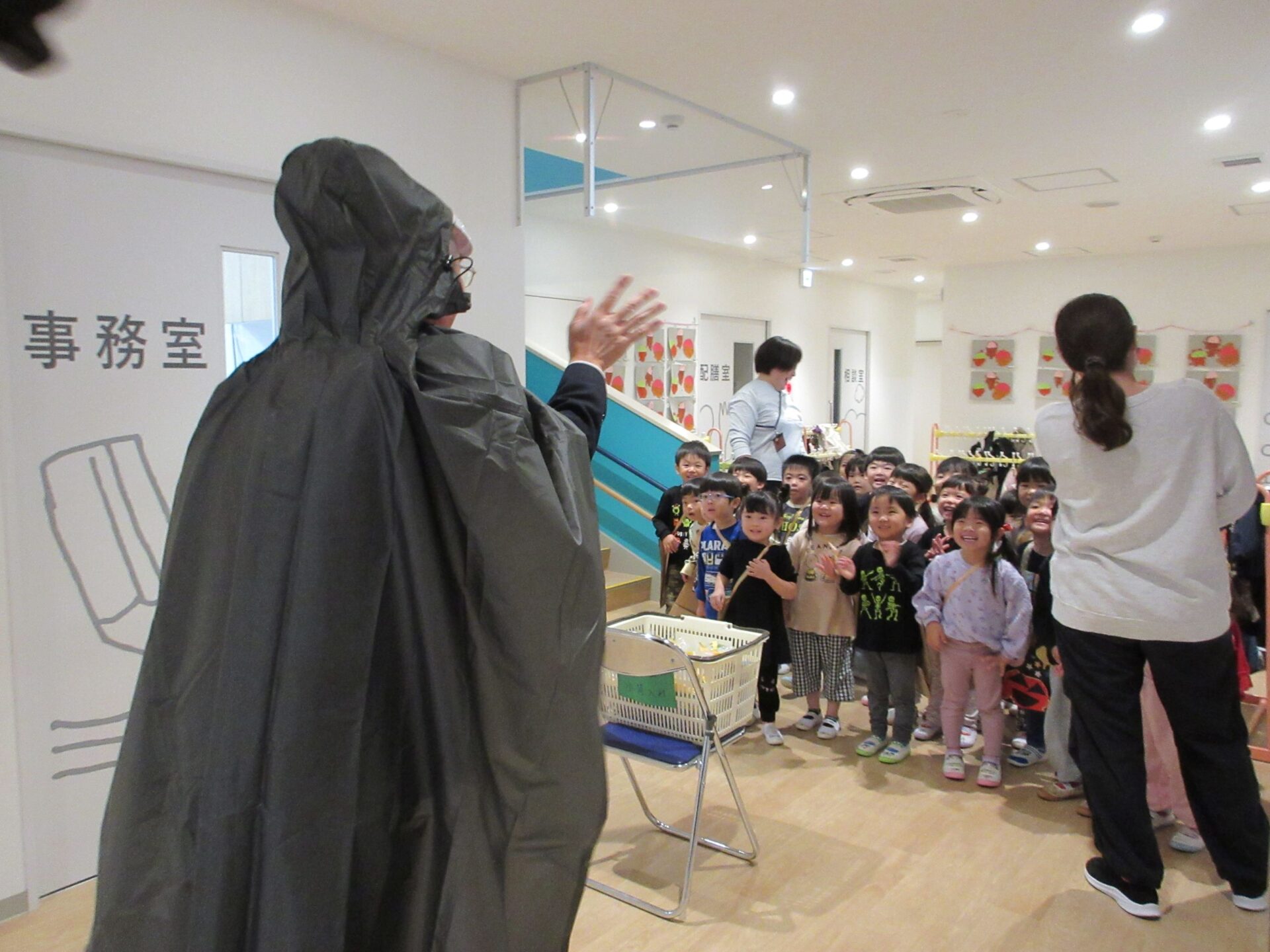 次は、3歳にじ組です。おやおや、みんな笑っています。どうしてでしょう。
