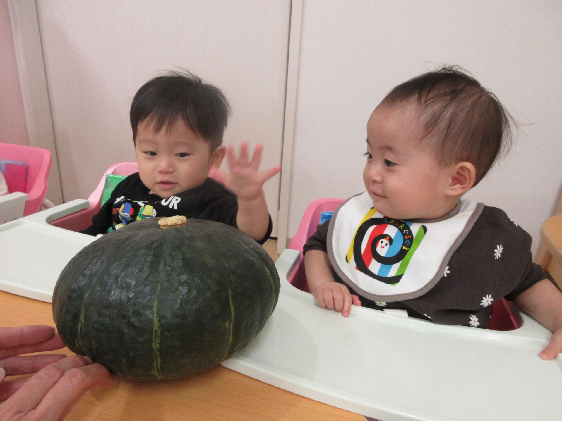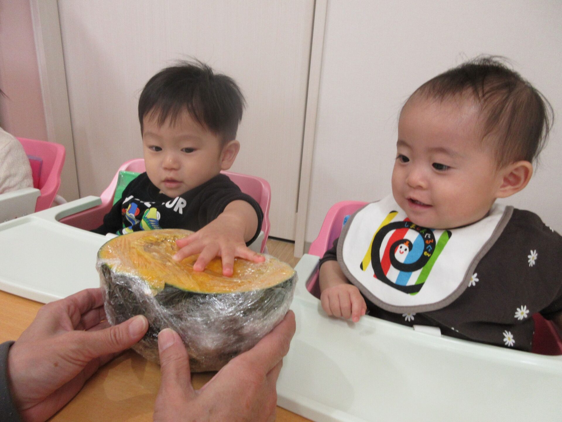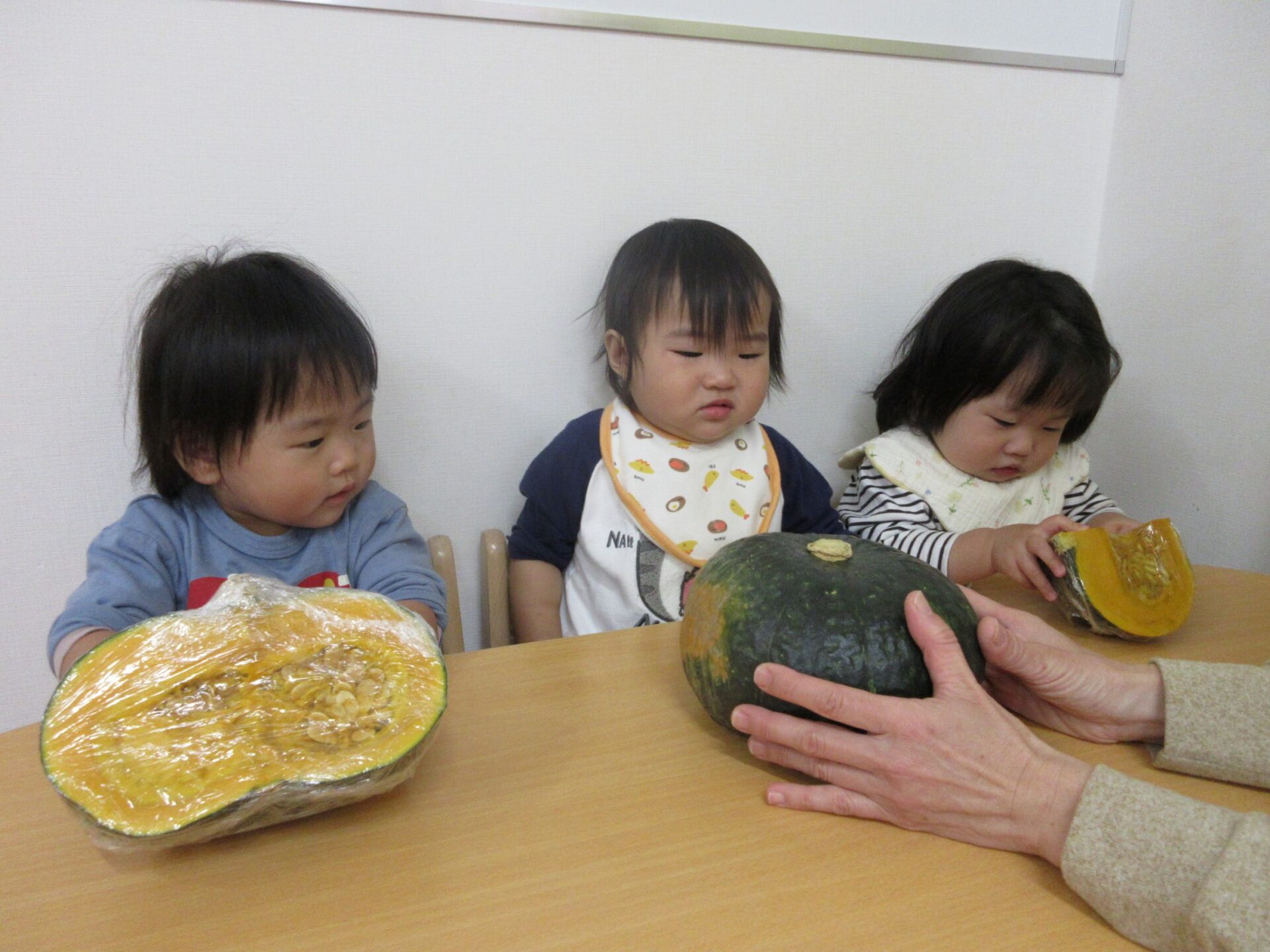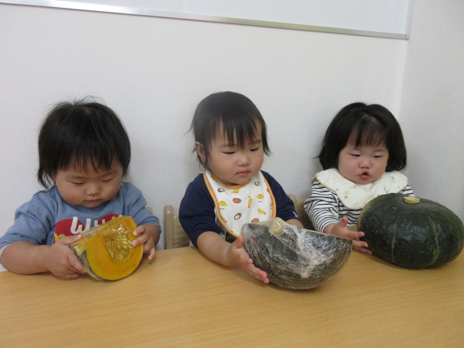 2025.12.01 お知らせ ブログ かぼちゃを触ったよ♪(うみ組 0歳) 11月6日に体験した感触遊びの様子です。今回はかぼちゃを触ってみました。 まずは、かぼちゃ丸ごと!おっきいね~♪ 次は、半分にカットしたかぼちゃ!どちらも興味津々です‼ かぼちゃの大きさにビックリしたかな?カットしたかぼちゃには興味津々の様子! かぼちゃを触ることに慣れてきたかな⁉丸ごとのかぼちゃは「これ何だろう・・・」と眺めていましたが、カットしたかぼちゃはすぐに手をのばして触っていました♪ 一覧へ戻る