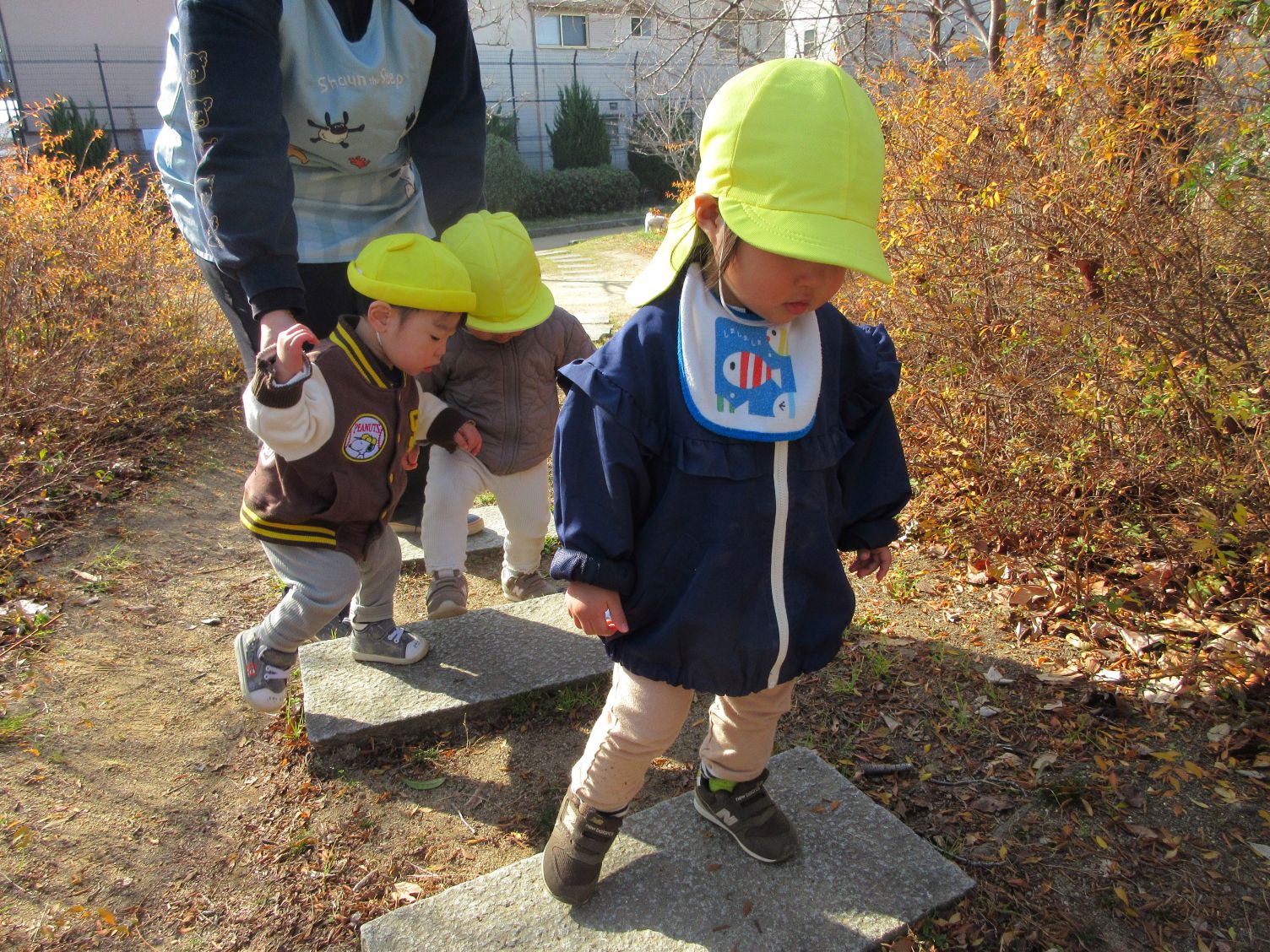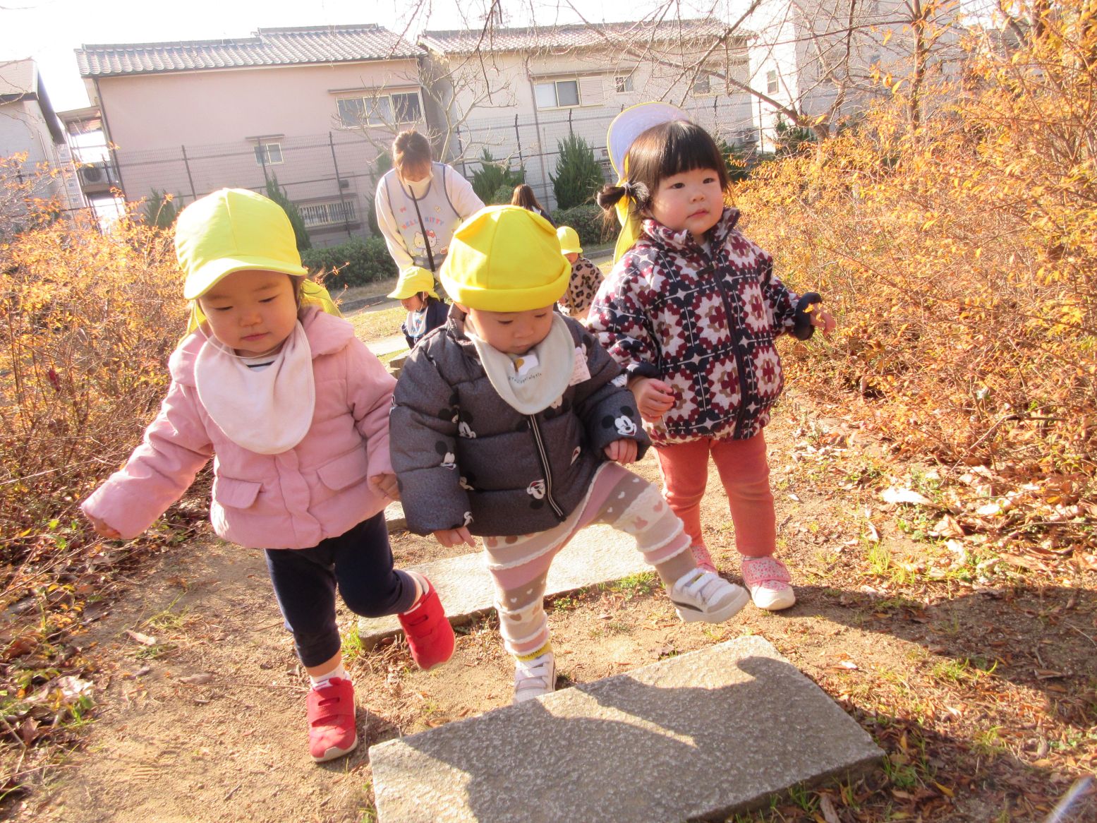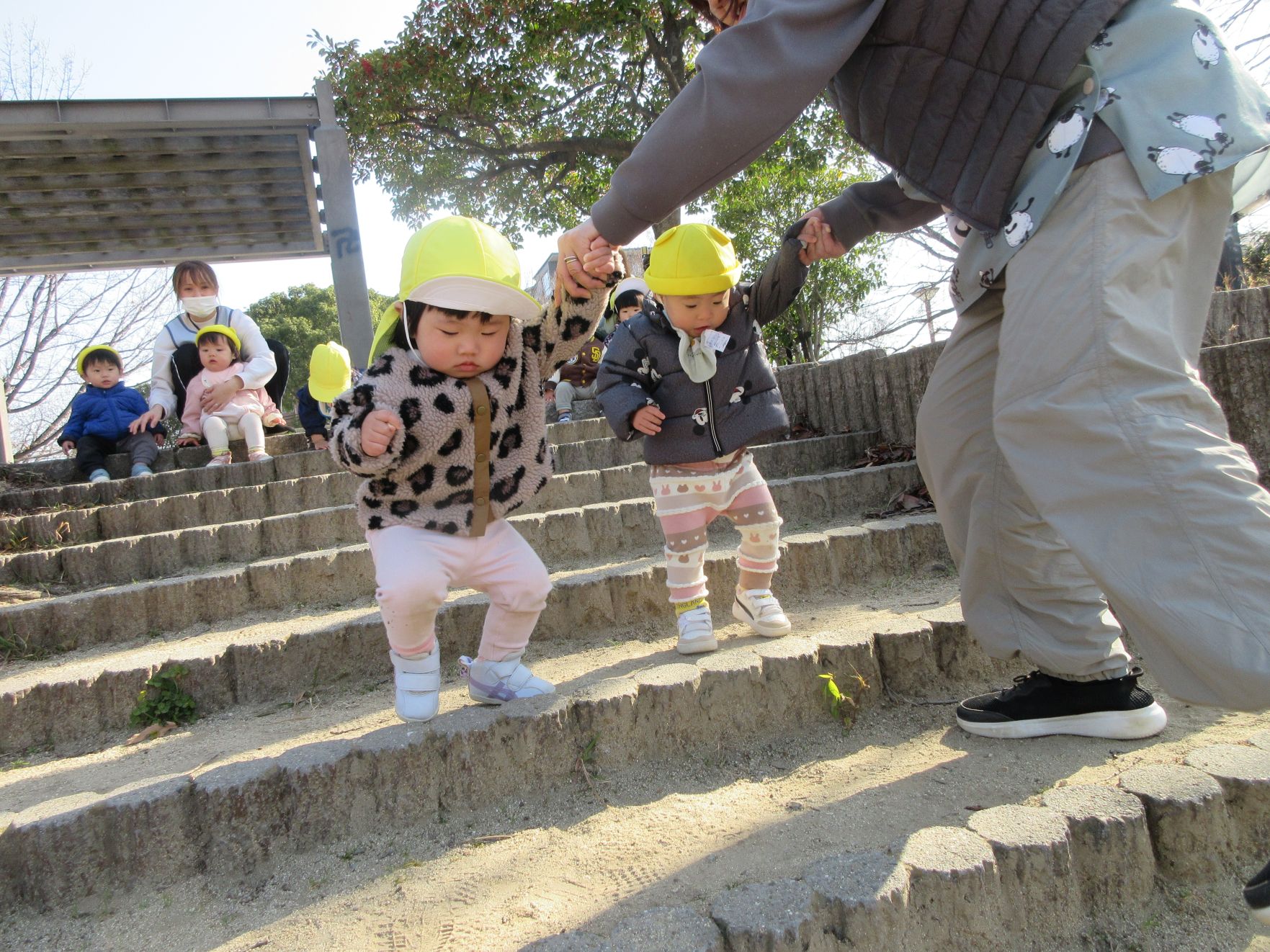階段を昇っていくよ♪ 手をついたお友だちを心配そうに見つめる姿も…大丈夫?