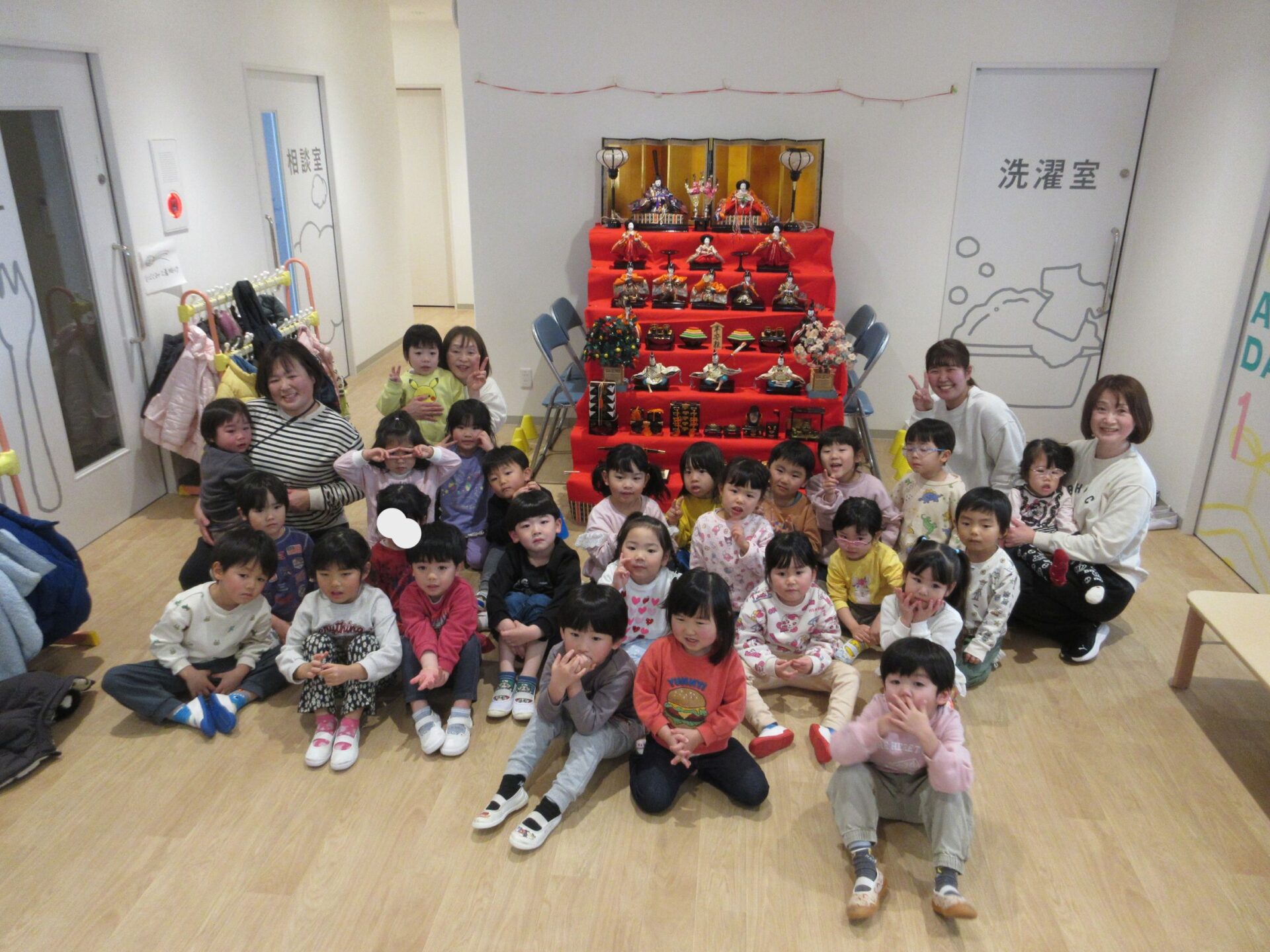 1階エントランスにひな人形が飾られたので、みんなで見に行き記念写真を撮りました♡