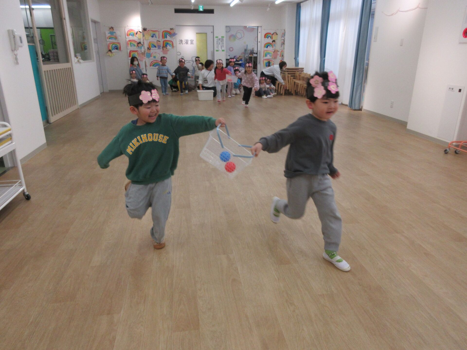作ったお面を付け、男の子vs女の子でリレー対決です🔥