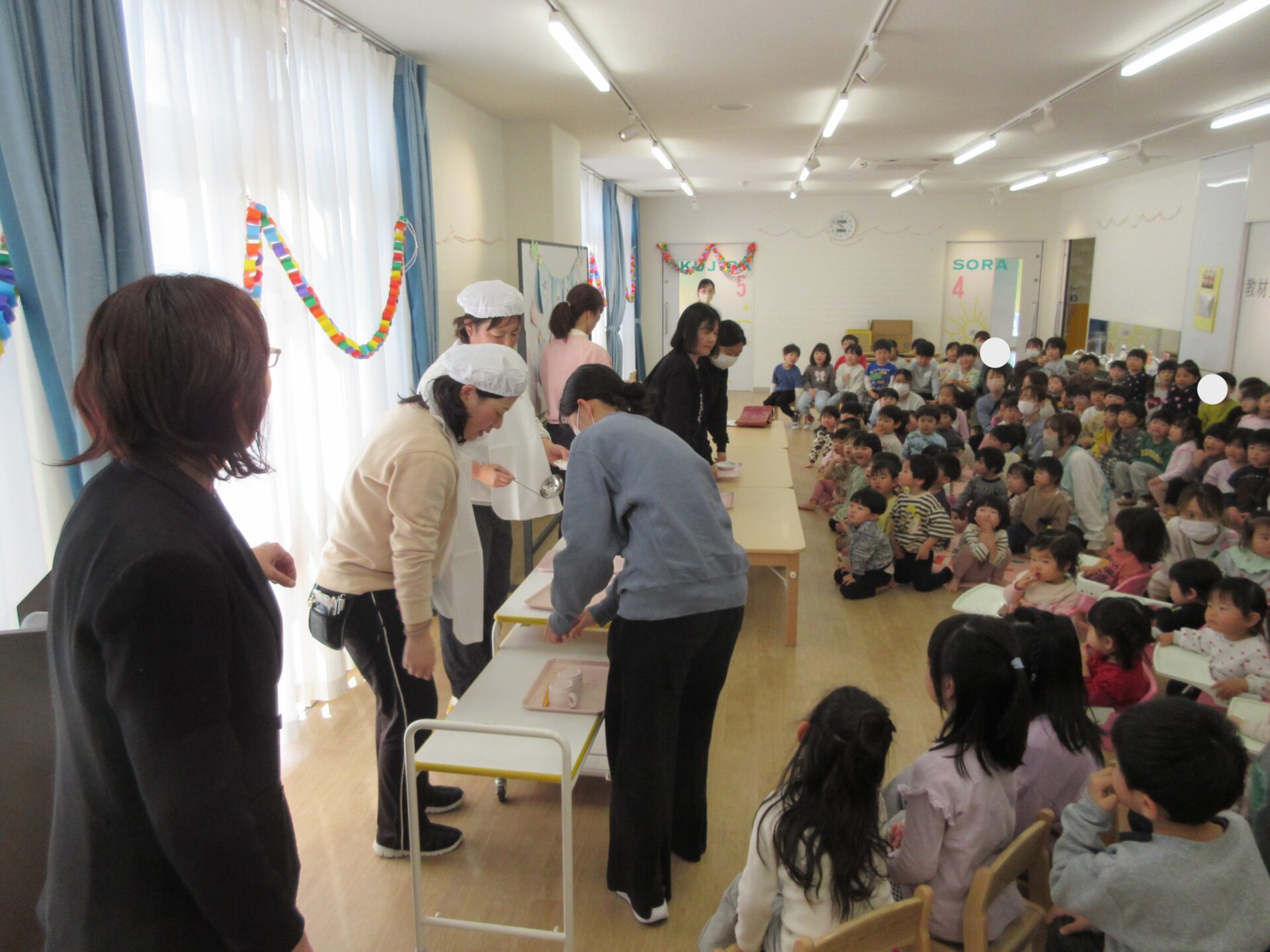 今は、先生たちが配膳し、配っている給食は、小学校へ行ったら自分たちでします!