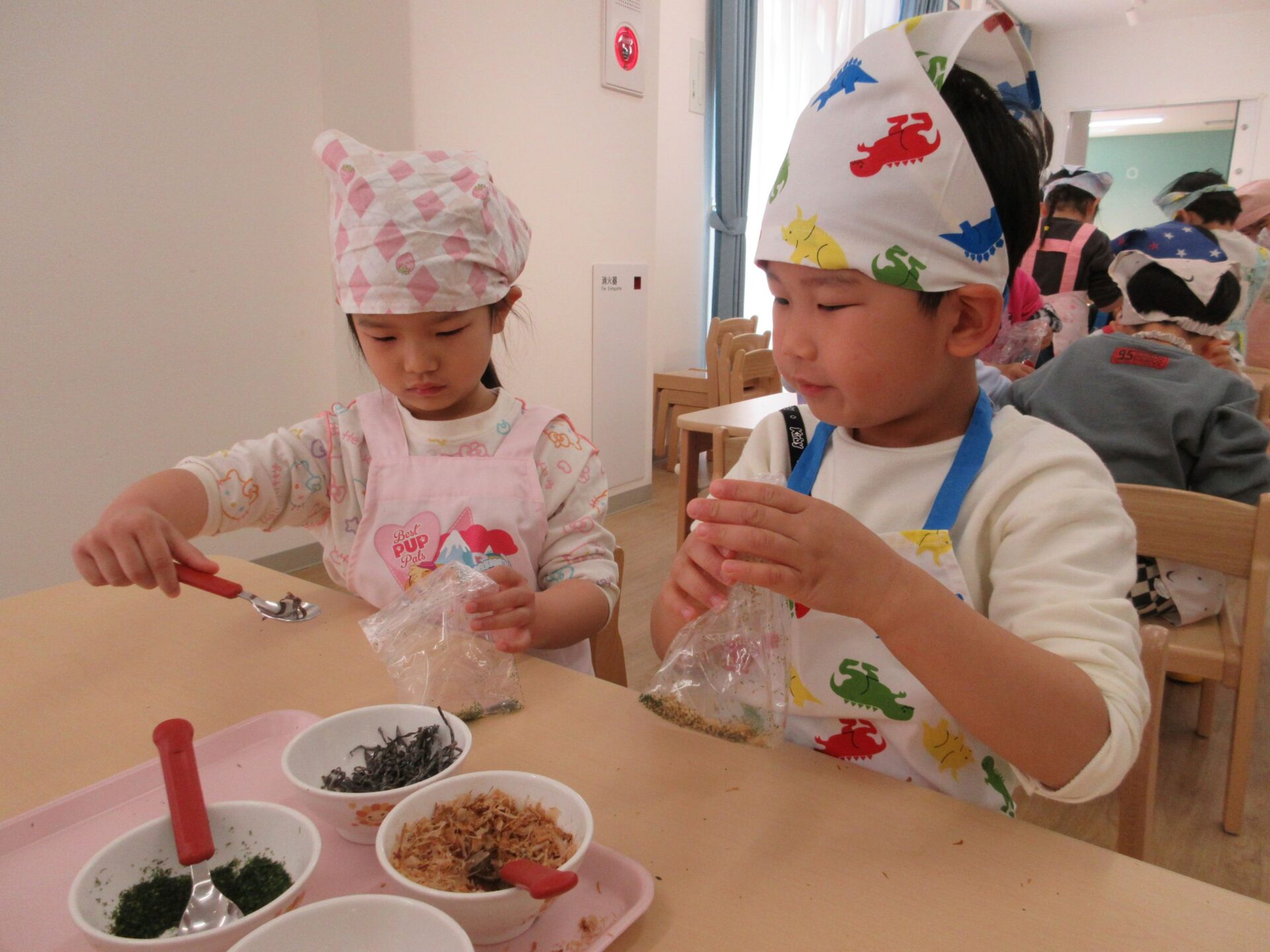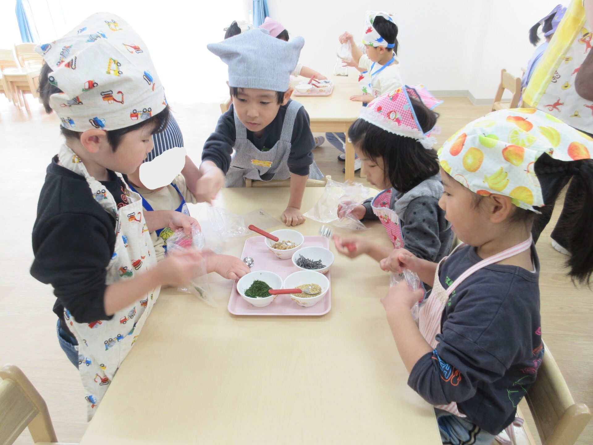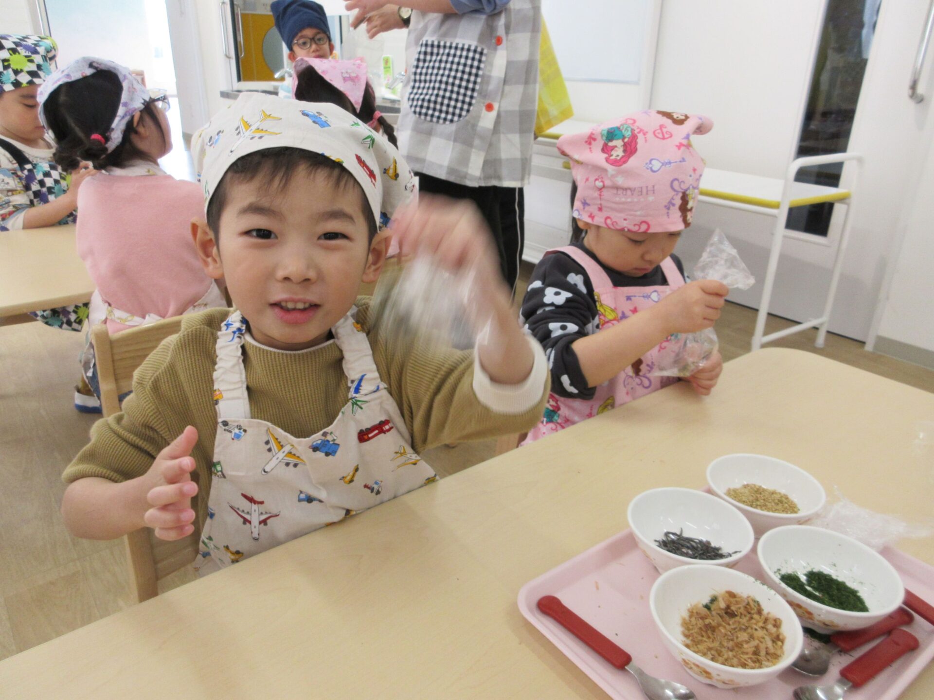 2026.03.30 お知らせ ブログ オリジナルおにぎり🍙 part1(4歳そら組) 3月17日にクッキングでオリジナルおにぎりを作りました!! まずは、みんなで順番にお米を洗いました!! 初めてのお米とぎにドキドキワクワク✨ 「ザラザラしてる~」とお米の感触を楽しみながら、お米とぎをしましたよ!! お米を炊いている間にふりかけ作りをしました♪ 塩昆布、かつおぶし、青のり、ごまの4種類の材料の中から、好きなものを自分たちで組み合わせてふりかけを作ります(≧◇≦) 「何を入れようかな~」と考えながらどんどん材料を入れていましたよ!! こぼさないように慎重に袋に入れています。 材料を入れたらシャカシャカタイム しっかりと混ざったらオリジナルふりかけの完成✨ 一覧へ戻る