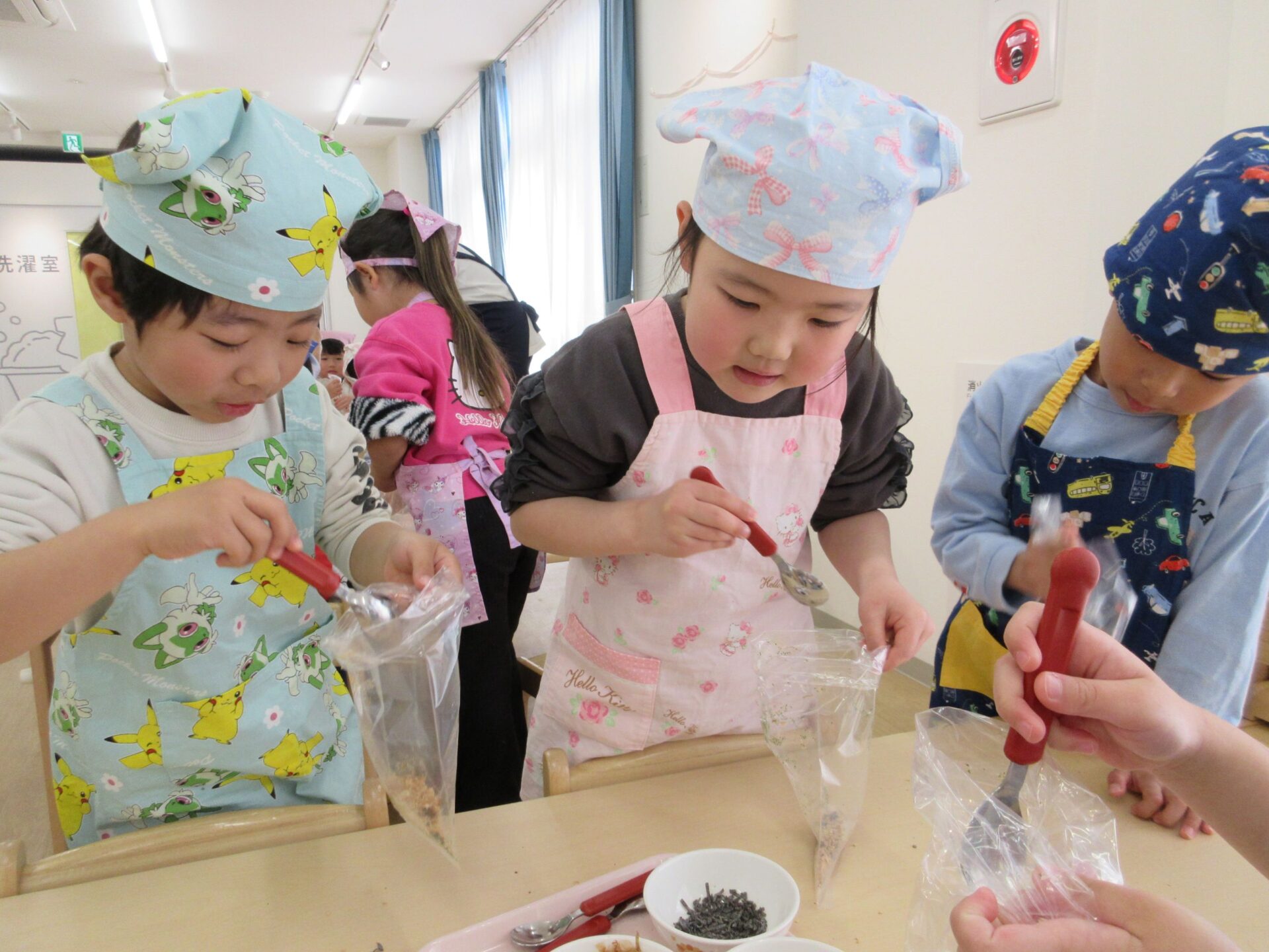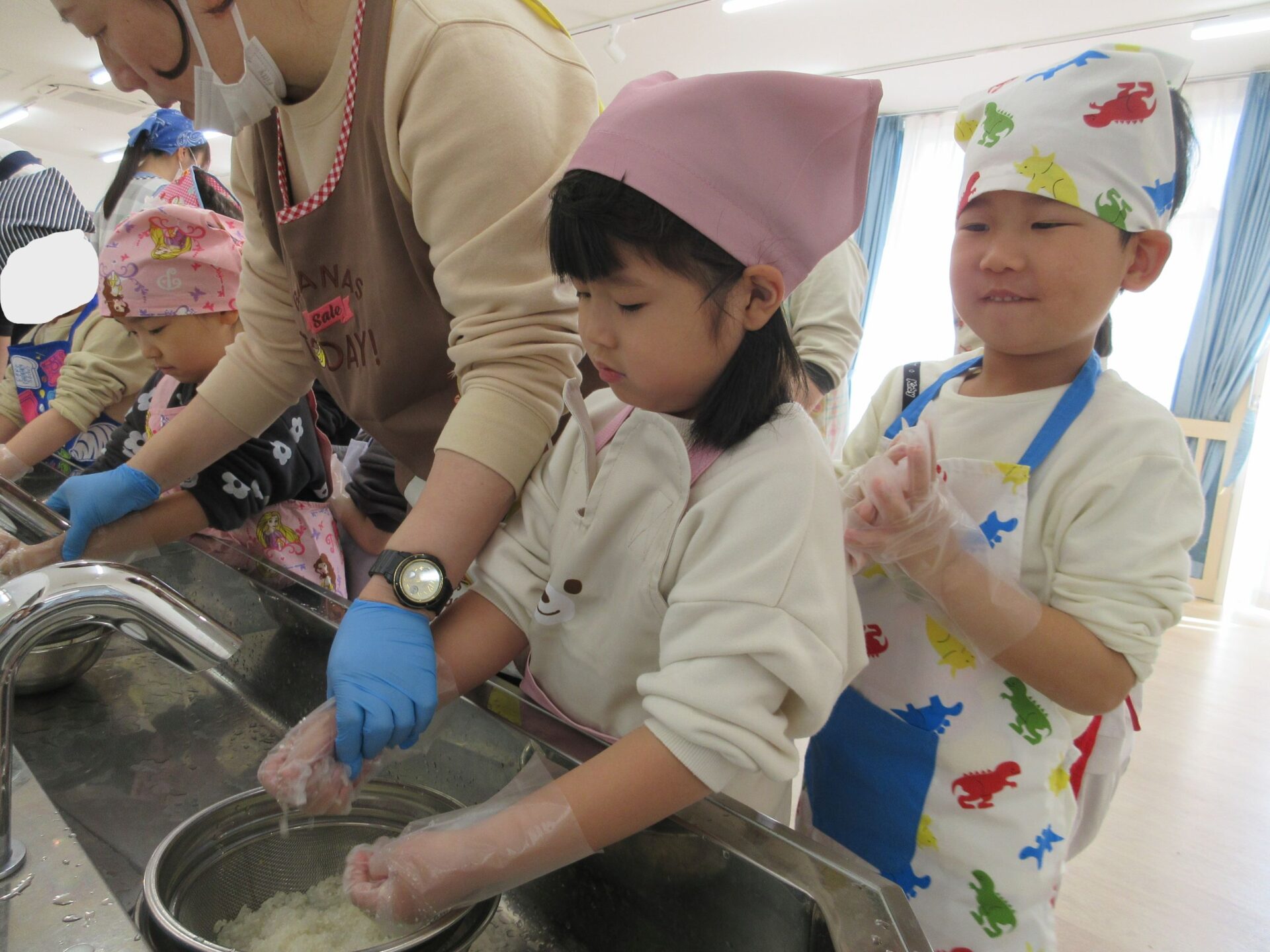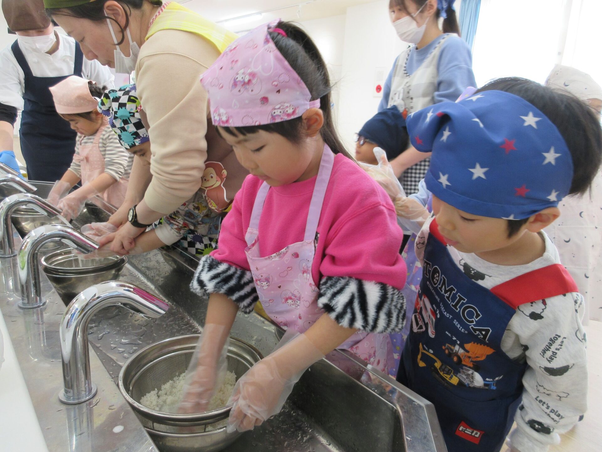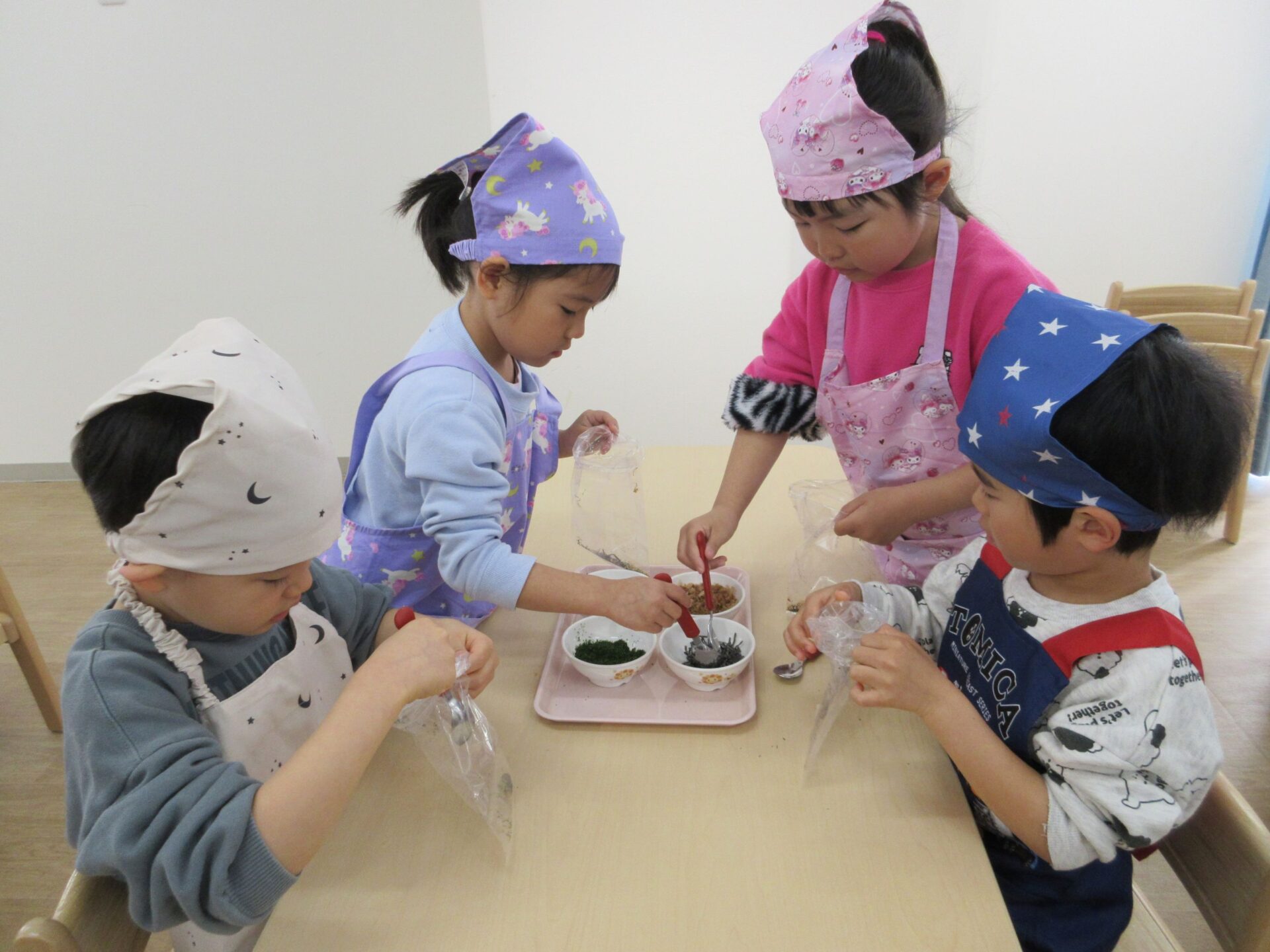 2026.03.30 お知らせ ブログ オリジナルおにぎり🍙 part1(4歳そら組) 3月17日にクッキングでオリジナルおにぎりを作りました!! まずは、みんなで順番にお米を洗いました!! 初めてのお米とぎにドキドキワクワク✨ 「ザラザラしてる~」とお米の感触を楽しみながら、お米とぎをしましたよ!! お米を炊いている間にふりかけ作りをしました♪ 塩昆布、かつおぶし、青のり、ごまの4種類の材料の中から、好きなものを自分たちで組み合わせてふりかけを作ります(≧◇≦) 「何を入れようかな~」と考えながらどんどん材料を入れていましたよ!! こぼさないように慎重に袋に入れています。 材料を入れたらシャカシャカタイム しっかりと混ざったらオリジナルふりかけの完成✨ 一覧へ戻る