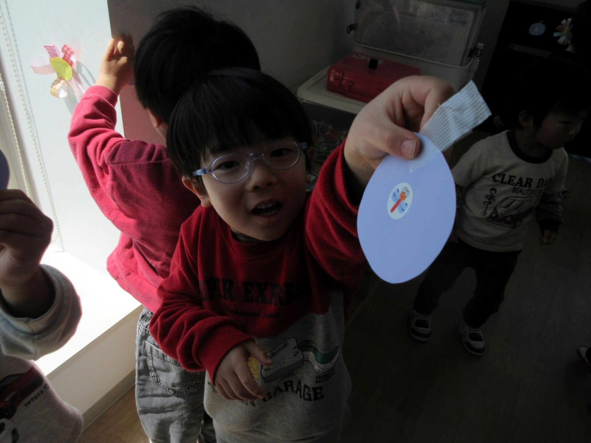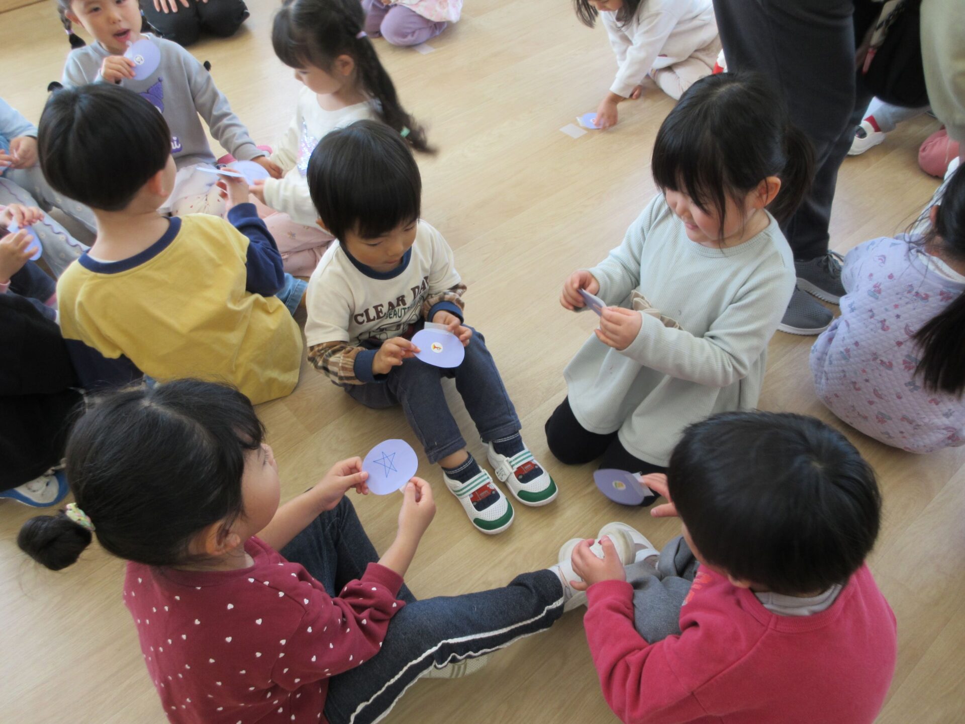 見つけたカードの裏には、〇や△などの記号が書かれており、次は同じ記号のお友だち探しが始まりました★