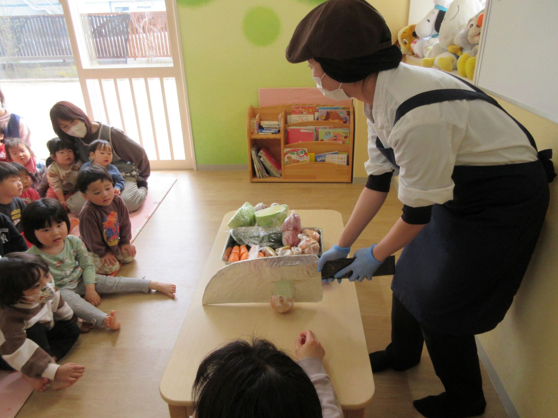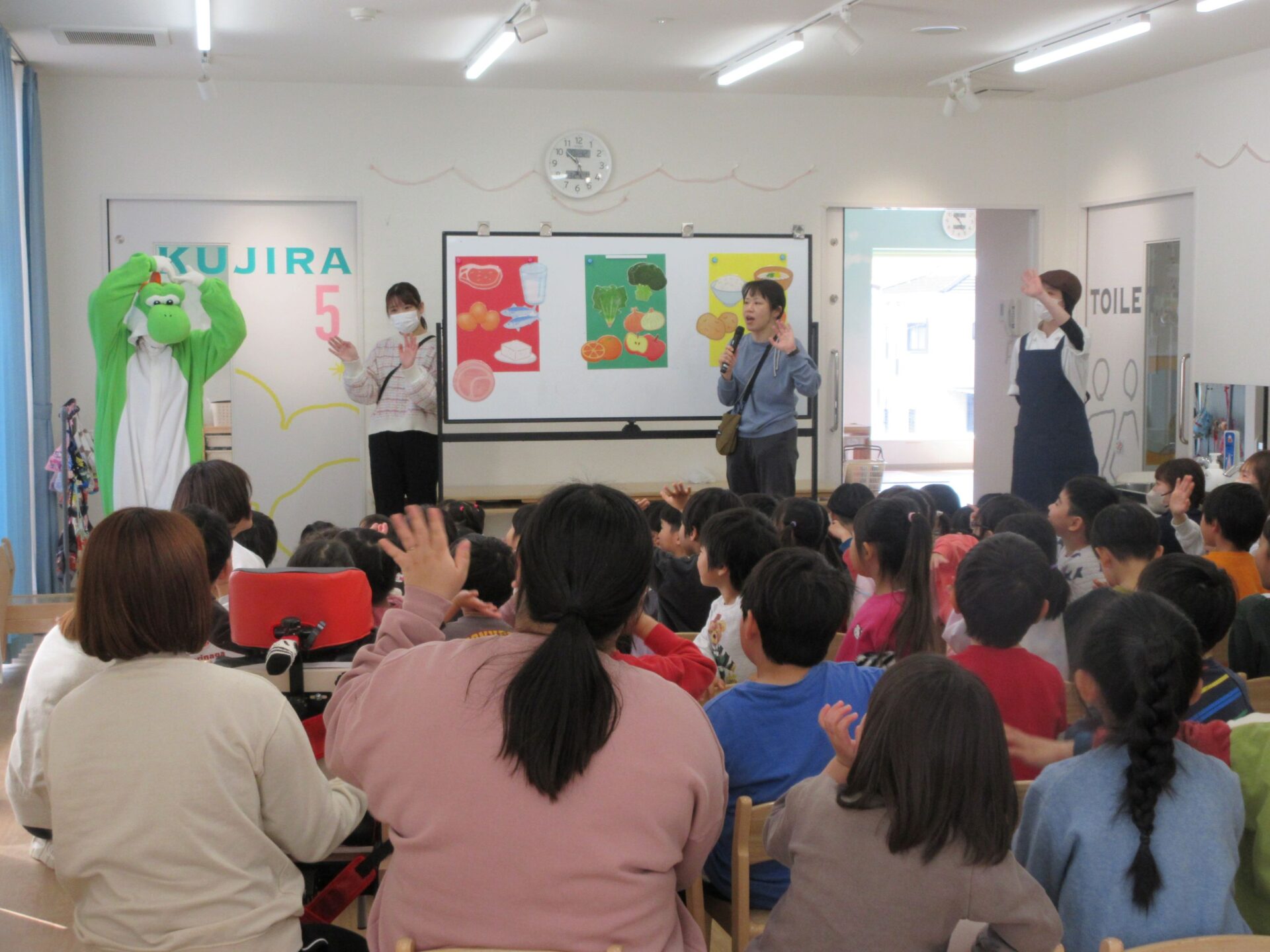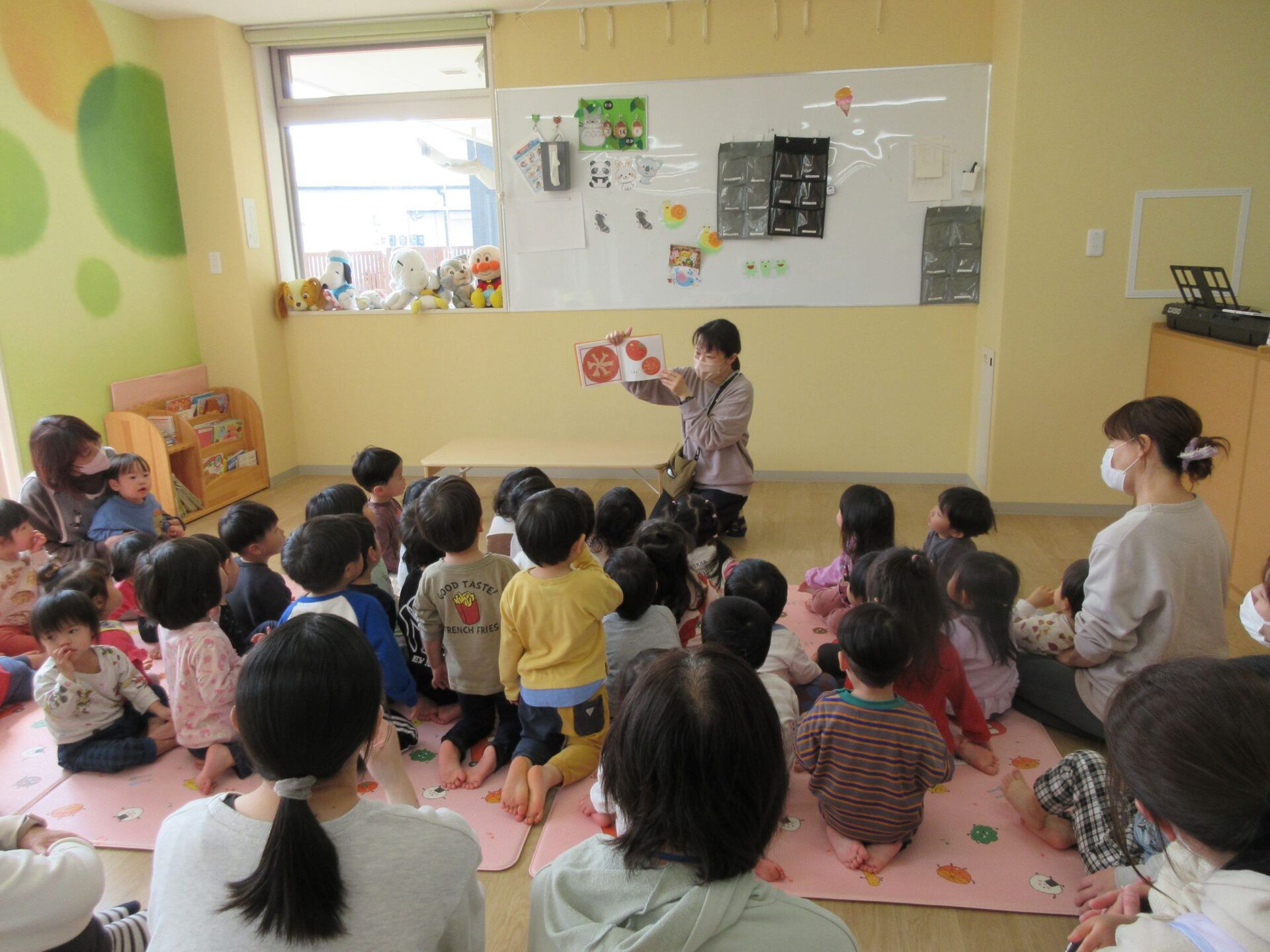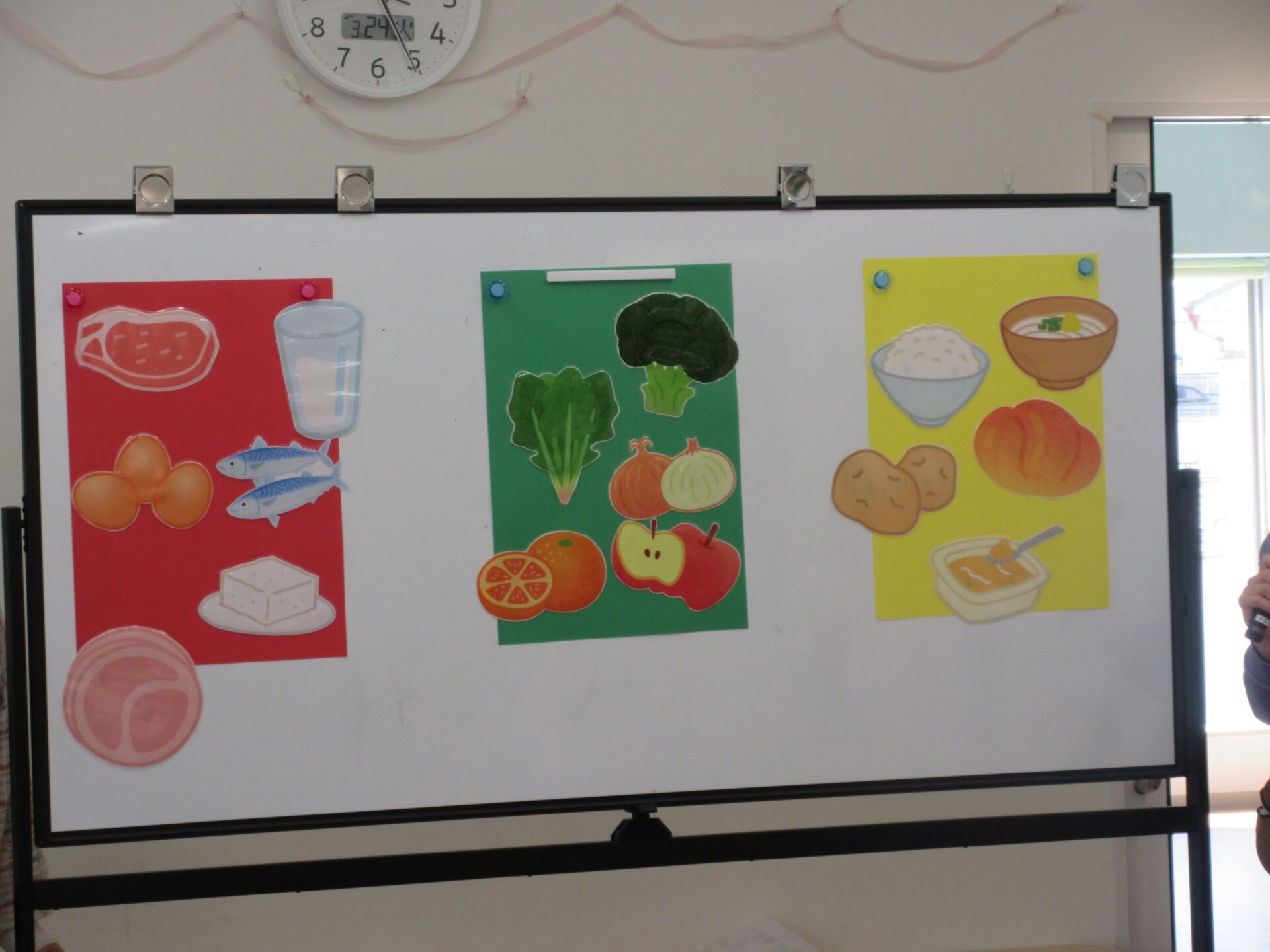 2026.04.16 お知らせ ブログ 「やさいのおなか 0~2歳」と「ヨッシーの3色食品群クイズ 3~5歳」 0~2歳さんは3月23日に食育で「やさいのおなか」の絵本を見ました!! 絵本を見た後は、大きな包丁でやさいをザクッと半分に!! みんな興味津々で見つめていますね♪やさいのおなかはどうなっているかな~? パカッ!!実際に半分に切ったやさいのおなかをみんなで見ました👀 みんなで野菜を触って「ブツブツしてる~」「ツルツル~」といろいろな触り心地を楽しんでいました☺ うみ組さんも野菜に興味津々ですね♪ 3~5歳さんは3月24日に食育で「3色食品群クイズ」をしました!! お肉や魚、たまごは赤色 野菜や果物は緑色 ご飯やパン、うどんは黄色に分かれていることを知り、それぞれの色がどんな働きをするのかも教えてもらいました💪✨ 3色食品群のお話を聞いていると、お腹を空かせたヨッシーがやってきました。赤色の食べ物を食べると筋肉が付いて力持ちになり、緑色の食べ物を食べるとばい菌をやっつけて健康になり、黄色の食べ物を食べると走ったりスキップをしたりして元気いっぱいになるヨッシーを見て、食べ物が何色の働きをするのかみんなでクイズをしました!! スペシャルゲストのヨッシーと一緒にクイズも楽しみ、食べ物の働きについて楽しく知ることが出来ました👏✨3月の行事なので、今はみんな、進級・卒園しましたね。 一覧へ戻る