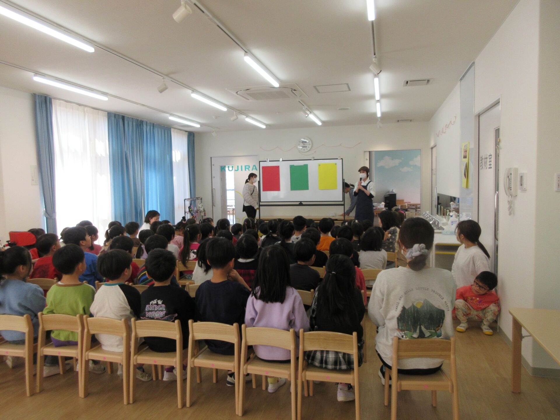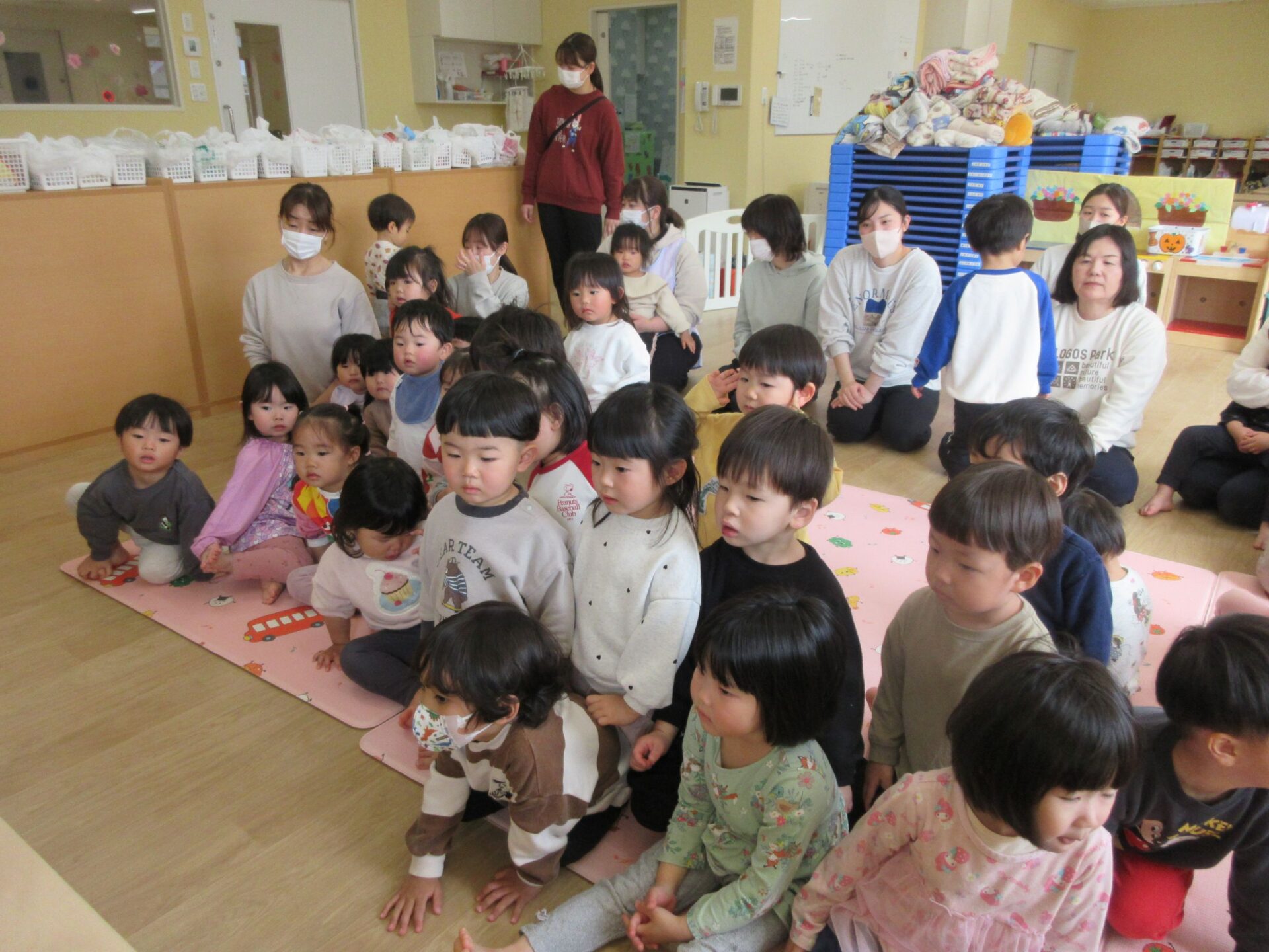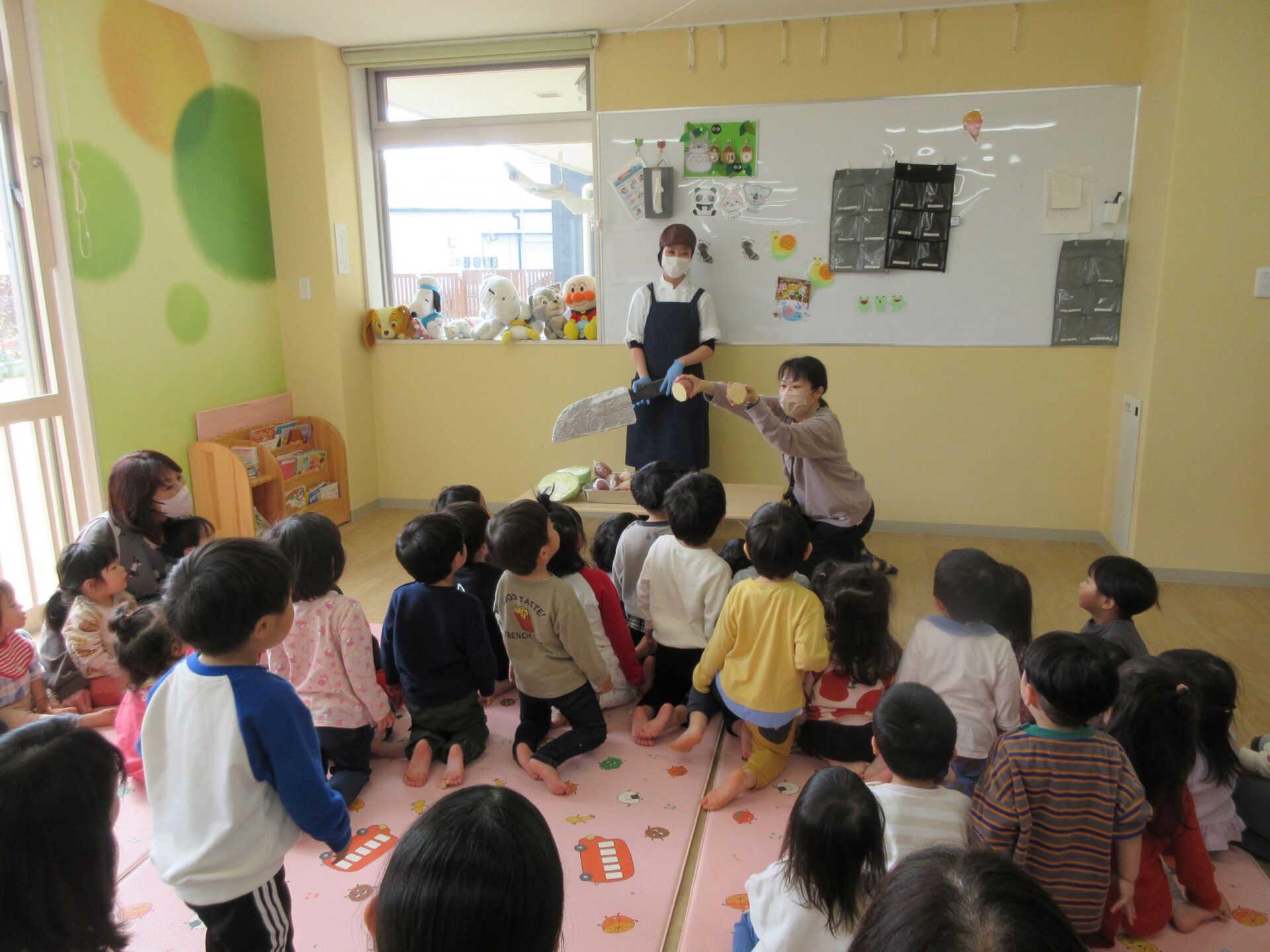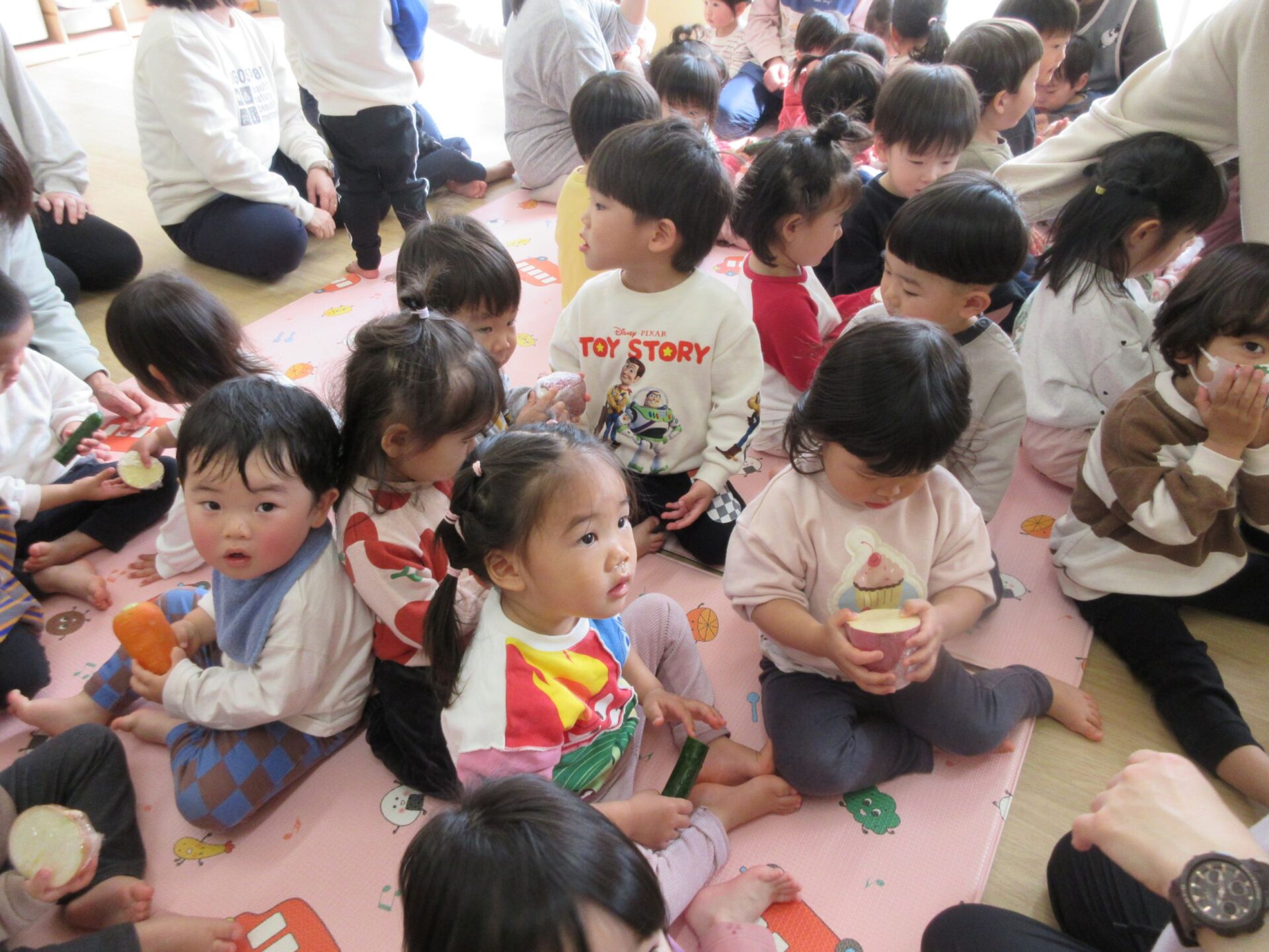 2026.04.16 お知らせ ブログ 「やさいのおなか 0~2歳」と「ヨッシーの3色食品群クイズ 3~5歳」 0~2歳さんは3月23日に食育で「やさいのおなか」の絵本を見ました!! 絵本を見た後は、大きな包丁でやさいをザクッと半分に!! みんな興味津々で見つめていますね♪やさいのおなかはどうなっているかな~? パカッ!!実際に半分に切ったやさいのおなかをみんなで見ました👀 みんなで野菜を触って「ブツブツしてる~」「ツルツル~」といろいろな触り心地を楽しんでいました☺ うみ組さんも野菜に興味津々ですね♪ 3~5歳さんは3月24日に食育で「3色食品群クイズ」をしました!! お肉や魚、たまごは赤色 野菜や果物は緑色 ご飯やパン、うどんは黄色に分かれていることを知り、それぞれの色がどんな働きをするのかも教えてもらいました💪✨ 3色食品群のお話を聞いていると、お腹を空かせたヨッシーがやってきました。赤色の食べ物を食べると筋肉が付いて力持ちになり、緑色の食べ物を食べるとばい菌をやっつけて健康になり、黄色の食べ物を食べると走ったりスキップをしたりして元気いっぱいになるヨッシーを見て、食べ物が何色の働きをするのかみんなでクイズをしました!! スペシャルゲストのヨッシーと一緒にクイズも楽しみ、食べ物の働きについて楽しく知ることが出来ました👏✨3月の行事なので、今はみんな、進級・卒園しましたね。 一覧へ戻る